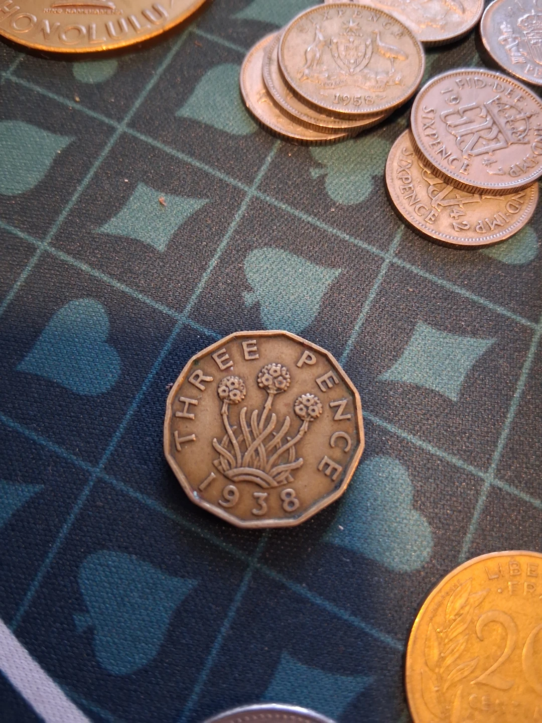 Selling a vintage Three Pence coin from 1938. It has a unique design with three plants on it. A great addition to any coin collection!
