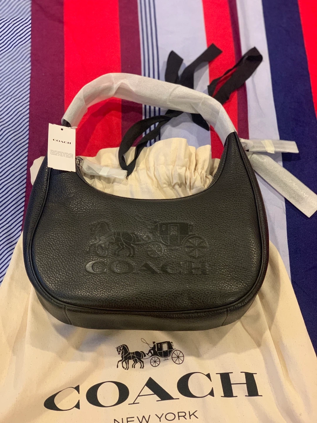 This is a black leather hobo handbag from Coach. It features the embossed horse and carriage logo on the front. It comes with its original dust bag.