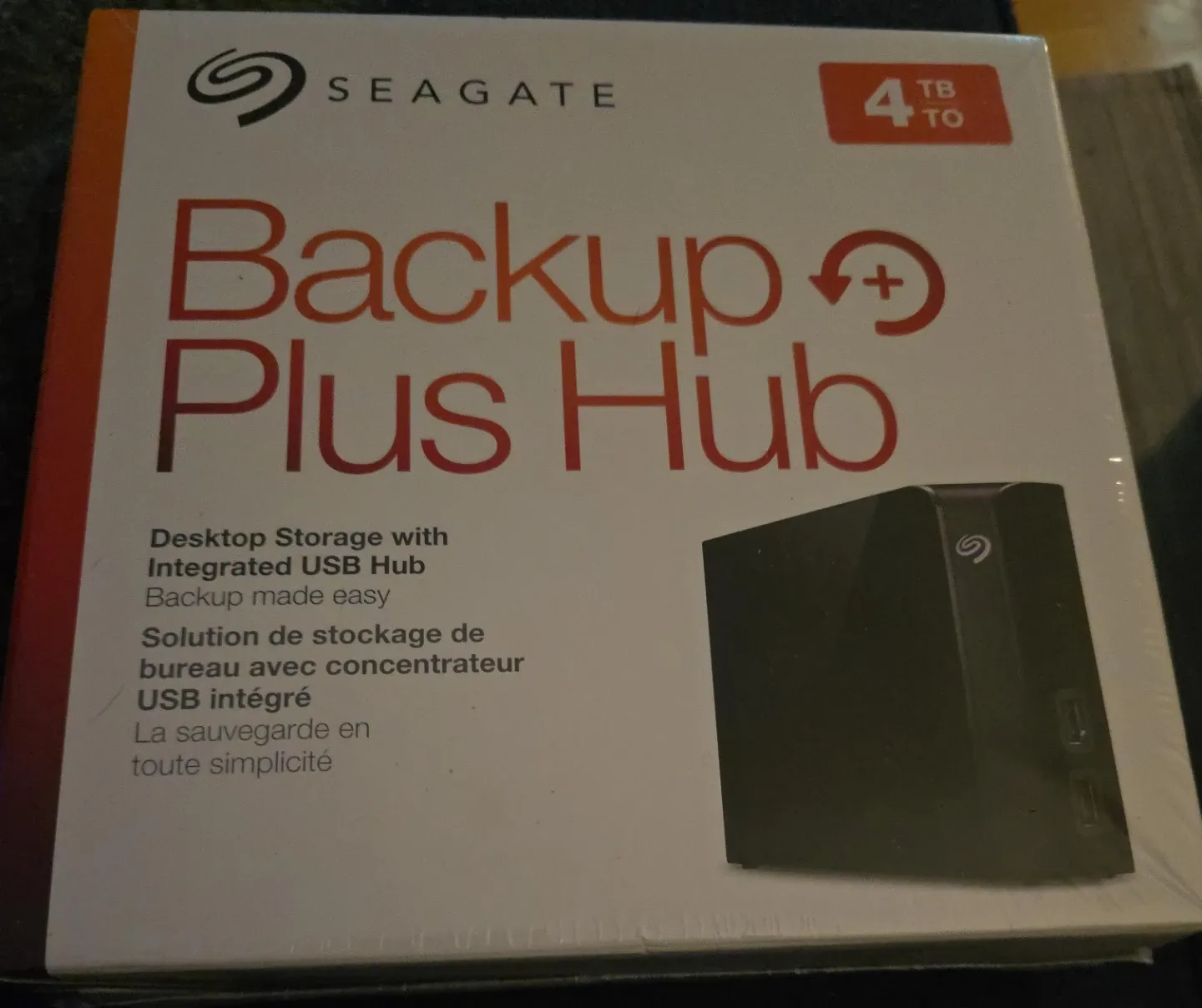 Selling a brand new Seagate Backup Plus Hub with 4TB of storage! This desktop storage solution has an integrated USB hub, making backups easy and providing extra connectivity. It's still sealed in its original packaging