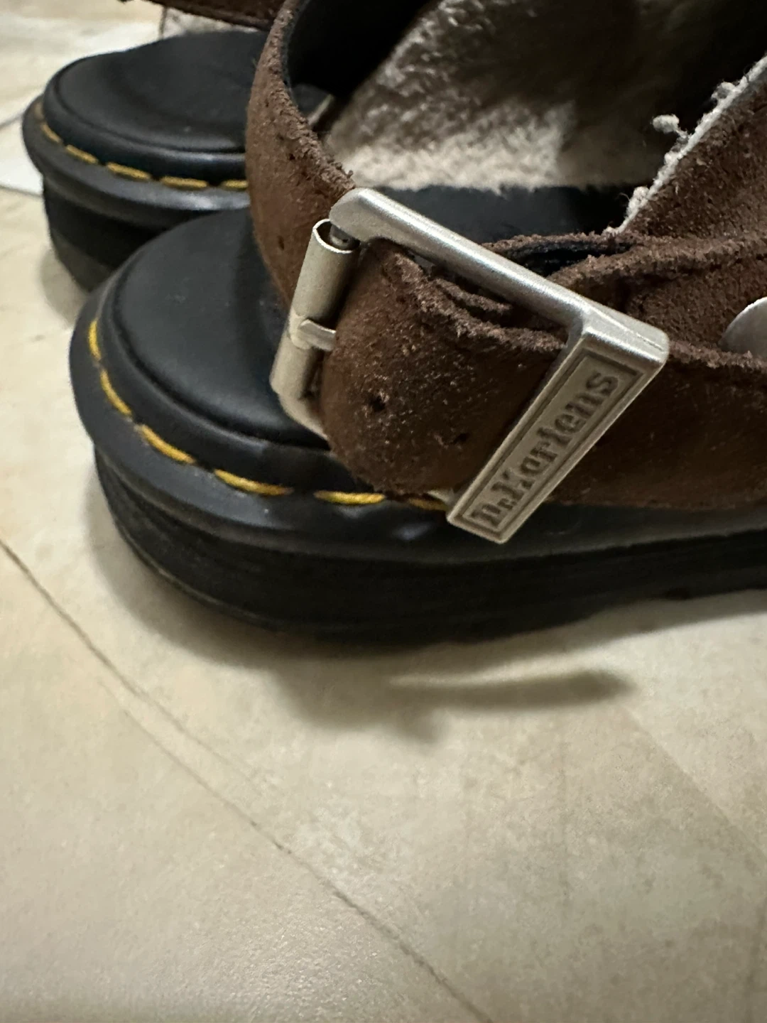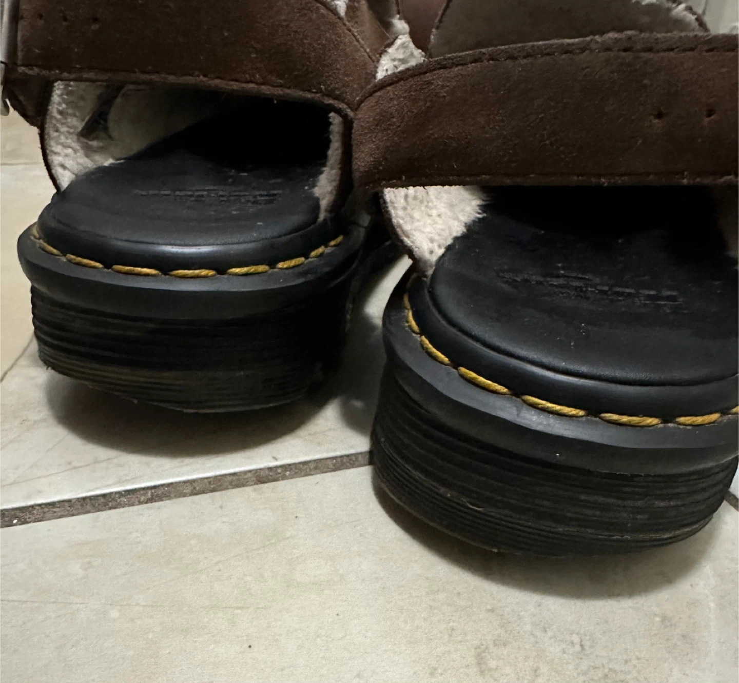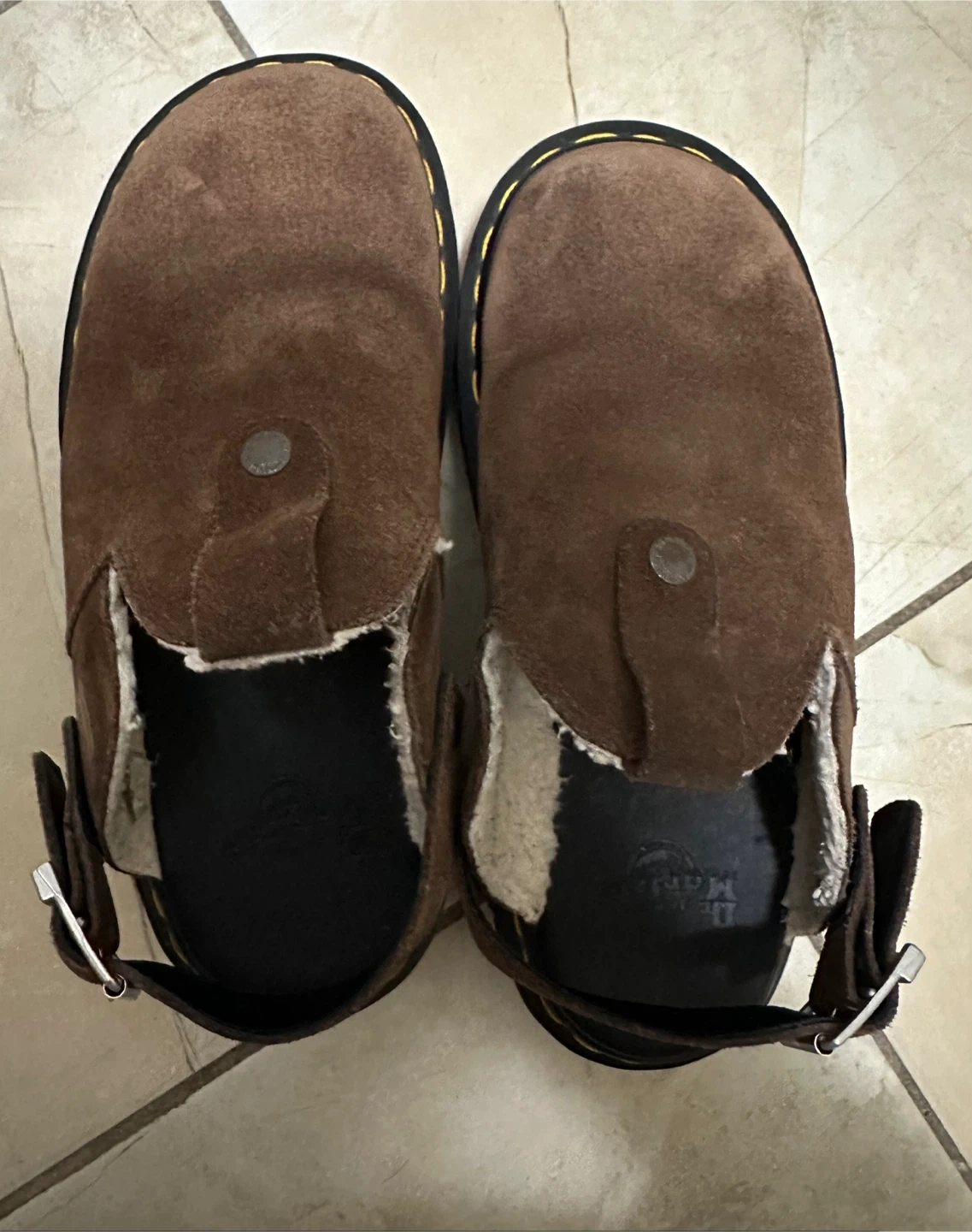 Dr. Martens sandals in brown suede with a cozy shearling lining. They feature adjustable straps and a durable sole. These are great for a comfortable, stylish everyday shoe!