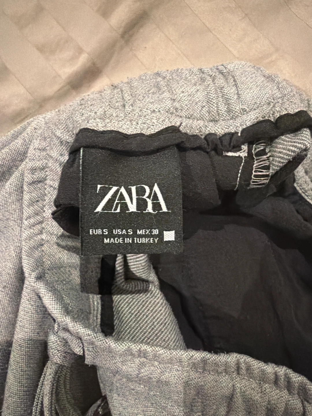 These grey ZARA joggers are a size small. They're made in Turkey and feature an elastic waistband with a drawstring. Perfect for casual wear or lounging!