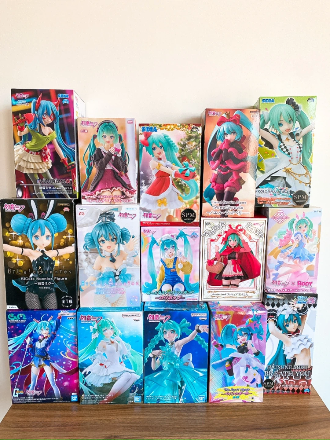Collection of Hatsune Miku figures from SEGA, including SPM and BiCute Bunnies series. Figures feature various outfits and poses. Excellent for any Hatsune Miku fan's collection!