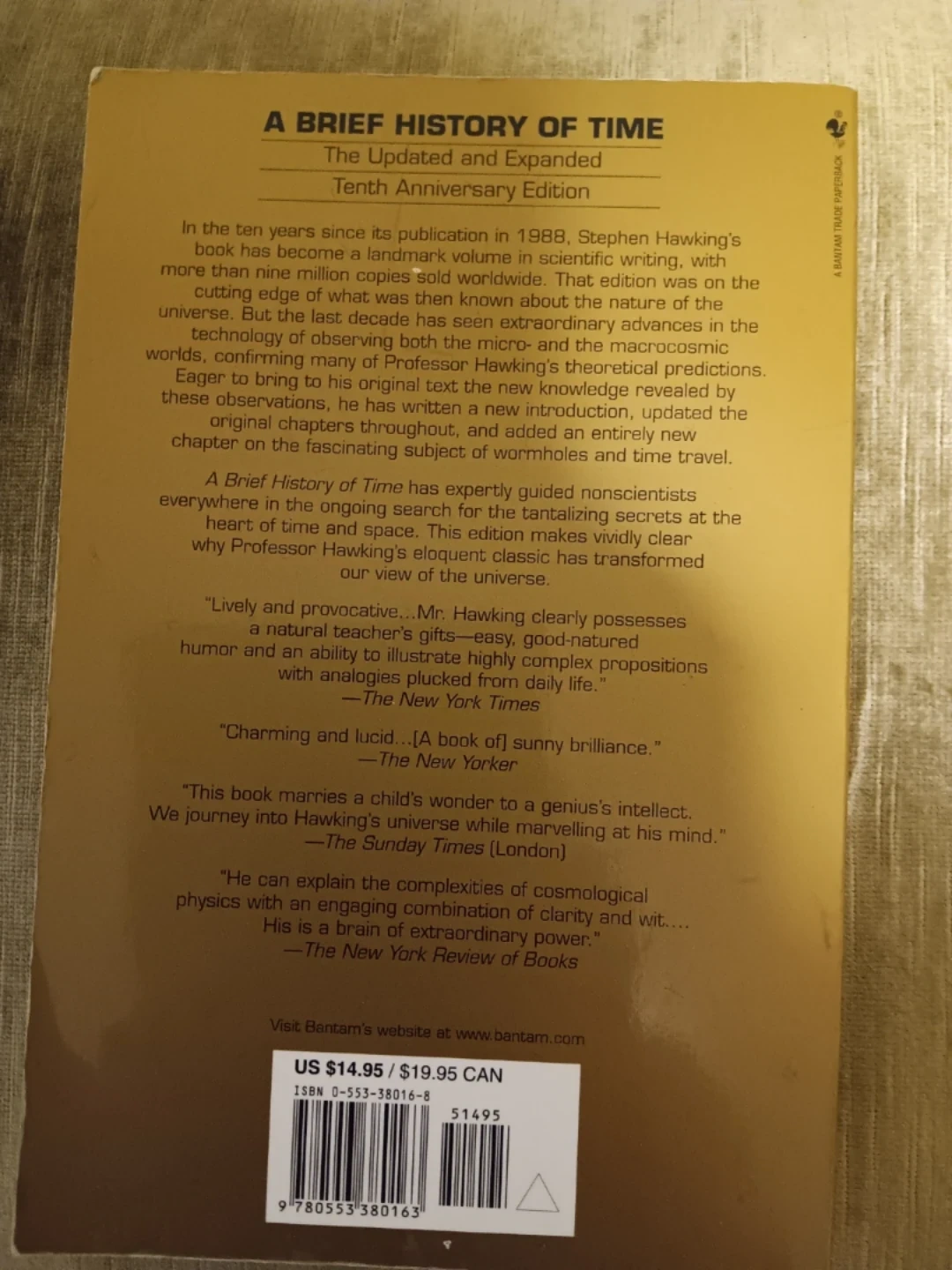 This is Stephen Hawking's 'A Brief History of Time,' the updated and expanded tenth anniversary edition. It offers a journey into the complexities of cosmology and the universe. It's a classic work for understanding spacetime and black holes.