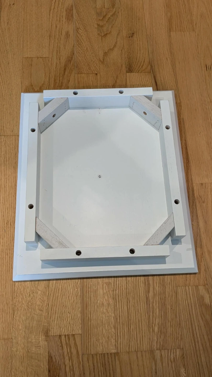 Solid wood table top 14 inches by 16 inches. It's made of solid wood.