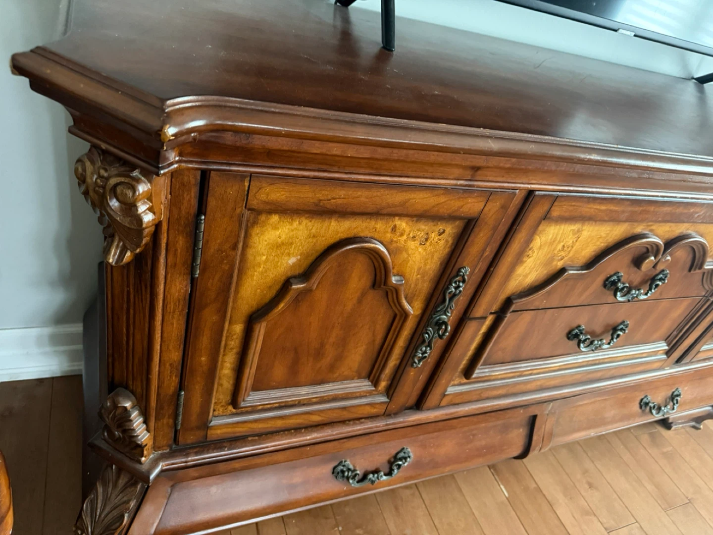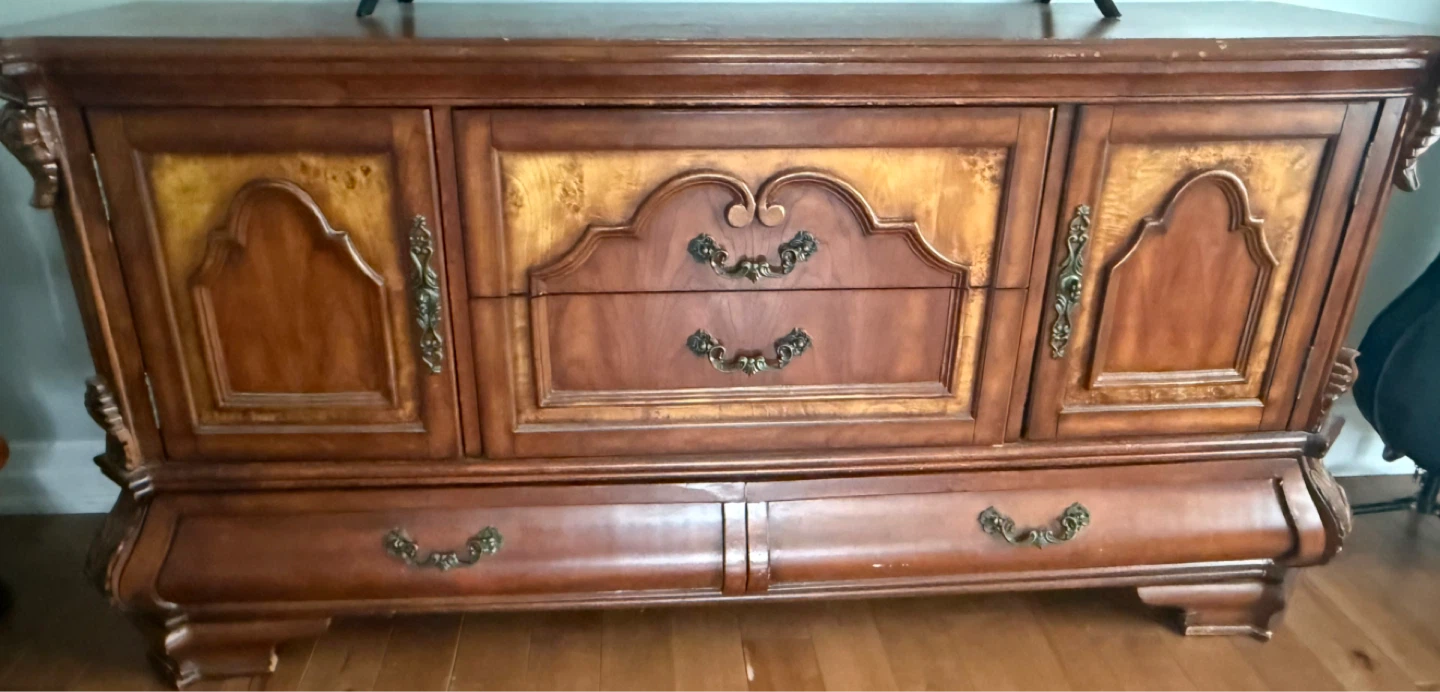A classic wooden dresser with ornate metal hardware. It features multiple drawers and cabinet doors for ample storage. The wood has a rich, warm finish and detailed carvings.