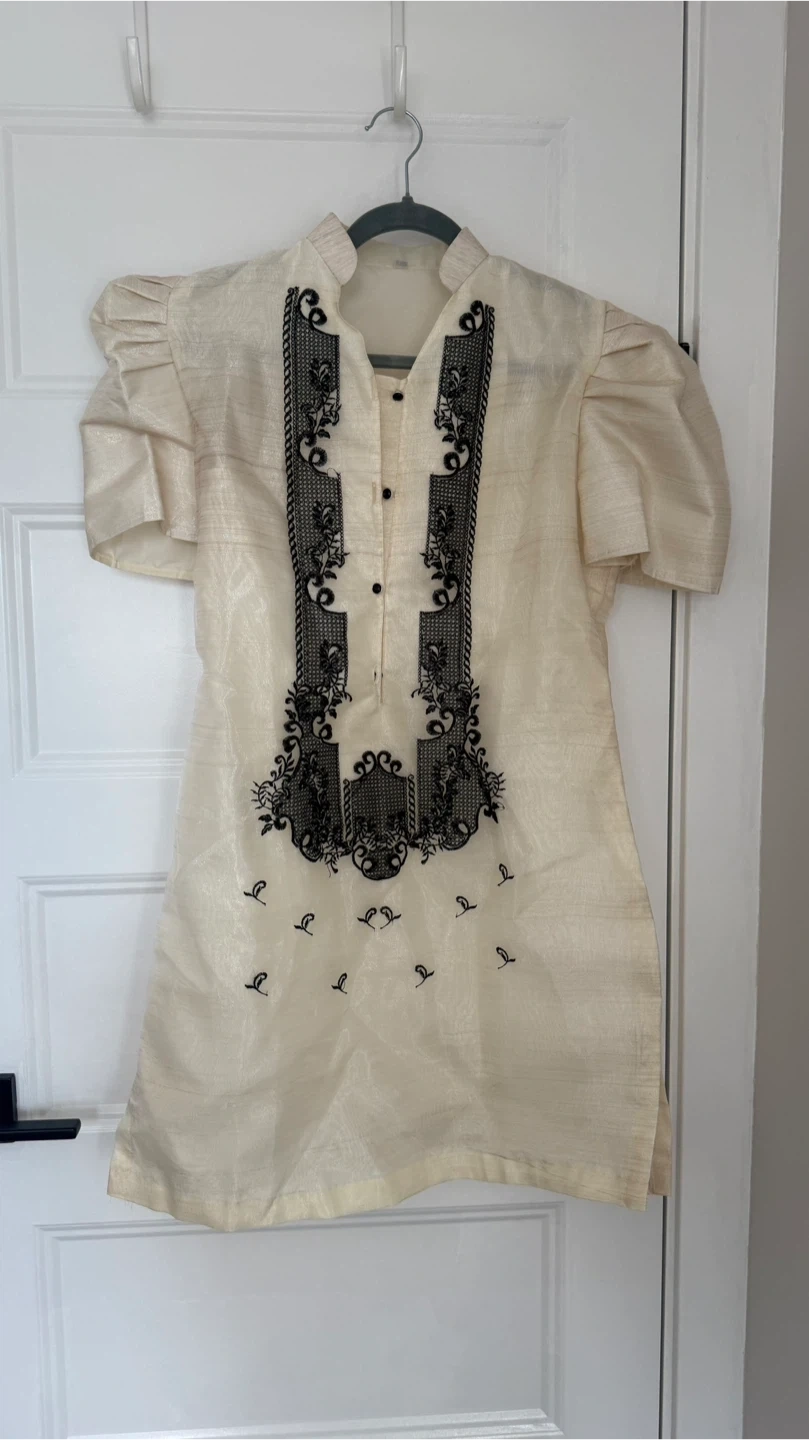 Cream-coloured Filipiniana with intricate black embroidery. It has short puffy sleeves and a button-up front. This traditional Filipino garment is often worn for formal occasions.