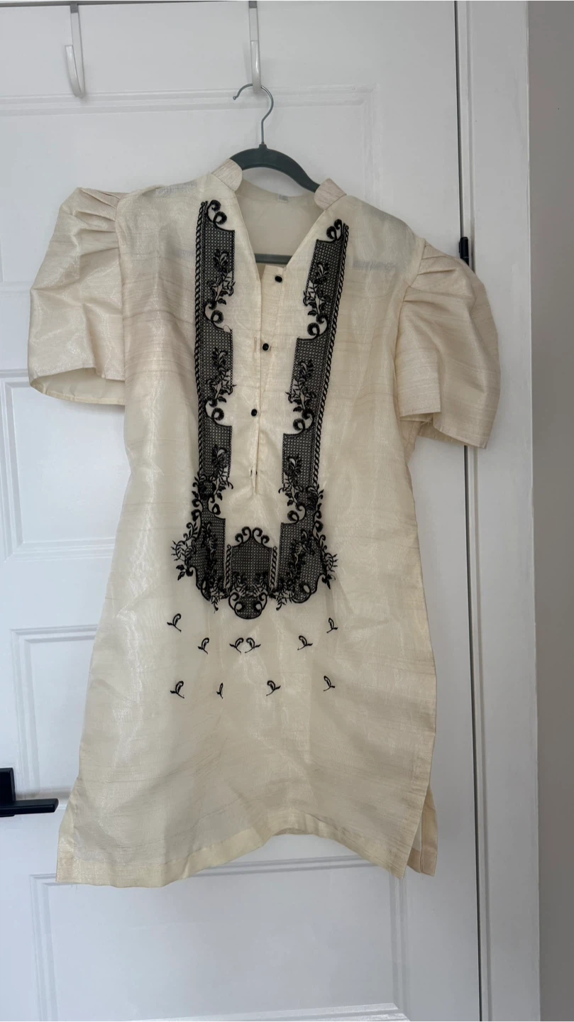 Cream-coloured Filipiniana with intricate black embroidery. It has short puffy sleeves and a button-up front. This traditional Filipino garment is often worn for formal occasions.