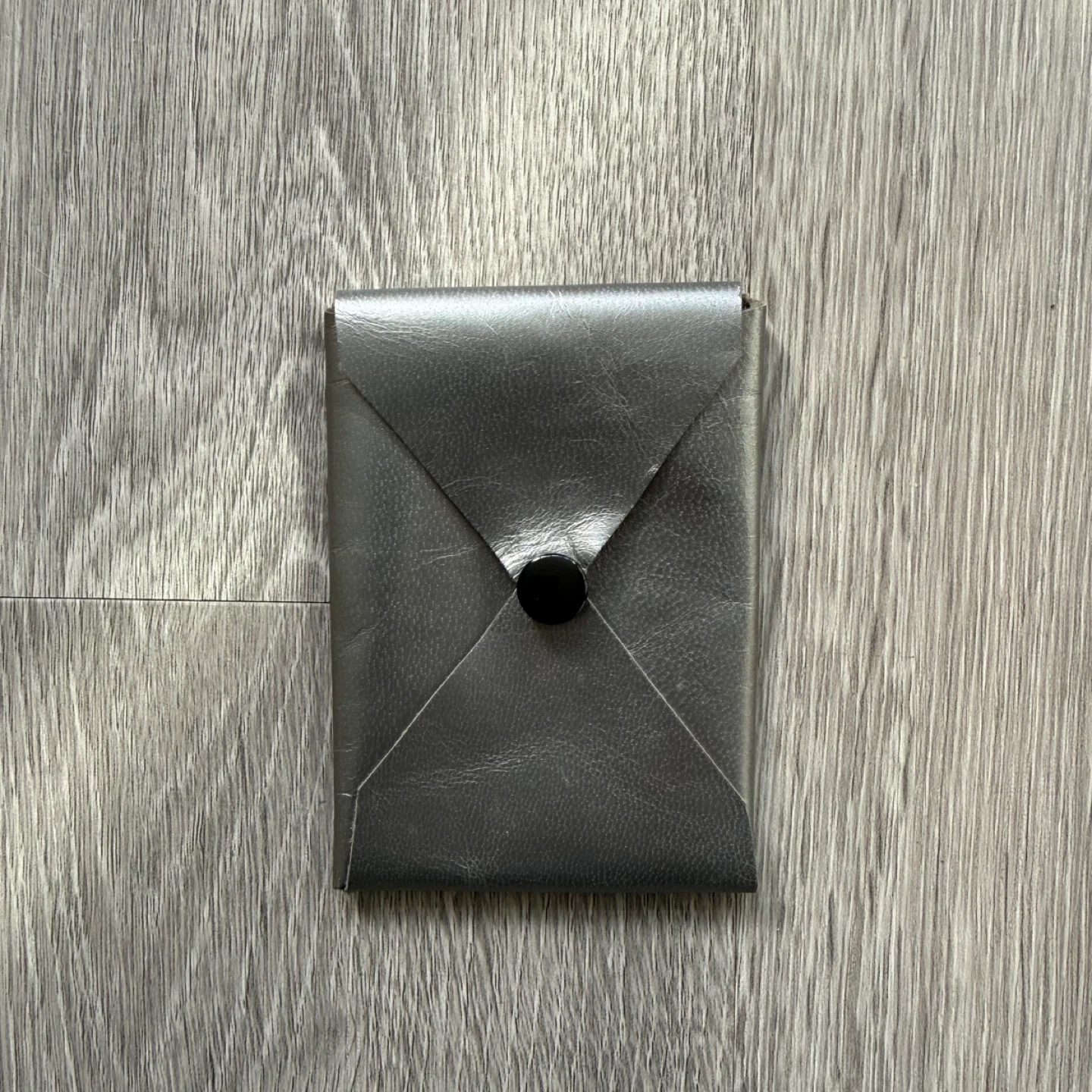 A silver grey leather card holder with a snap closure. It's perfect for keeping your essential cards organized.