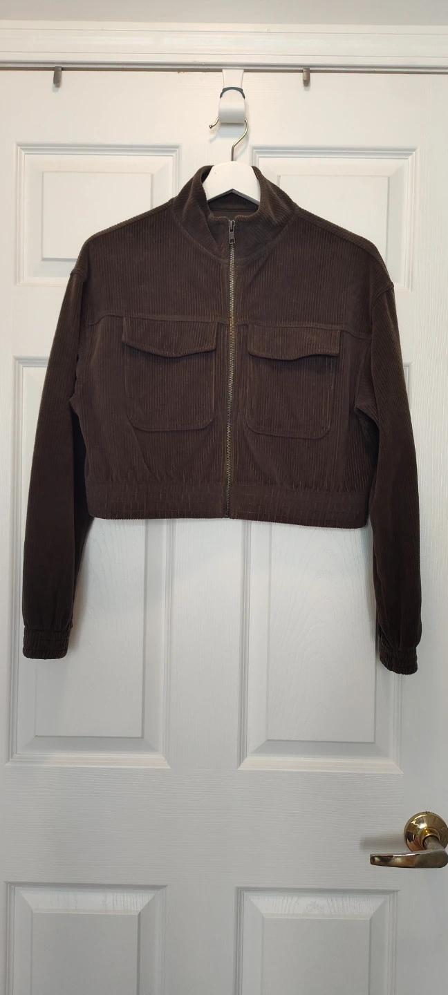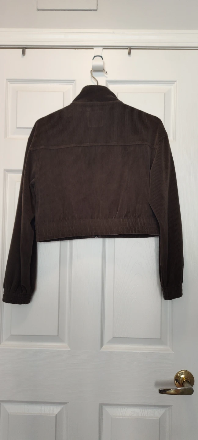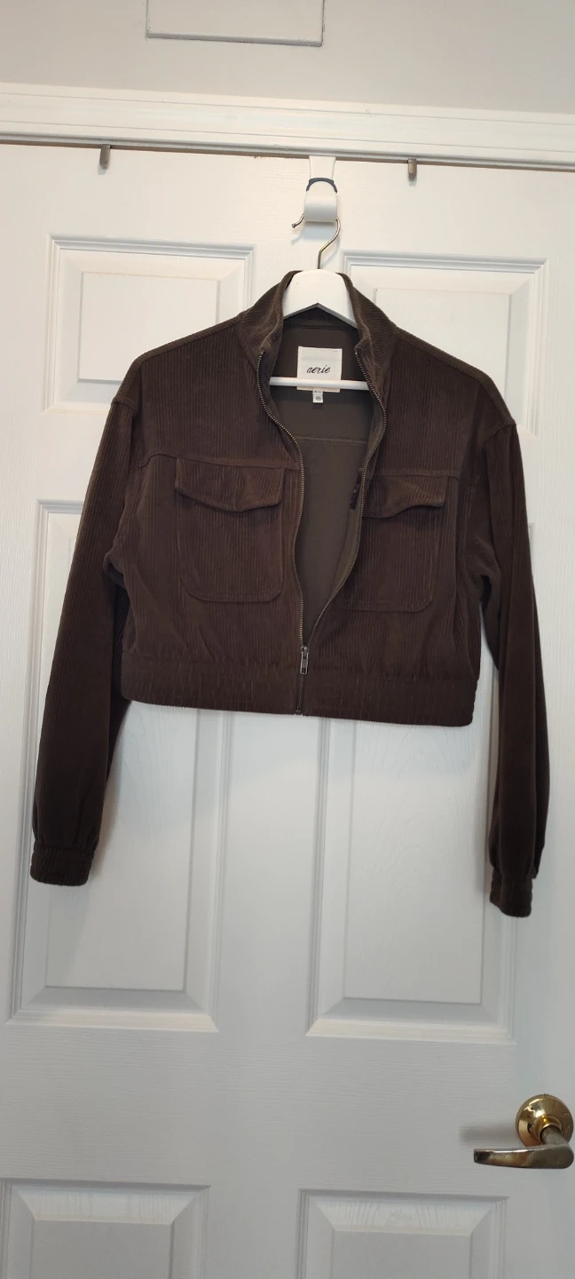 It's an Aerie cropped jacket in a dark green corduroy. The size is XS and it's made from a soft fabric. This jacket is perfect for layering on cooler days!