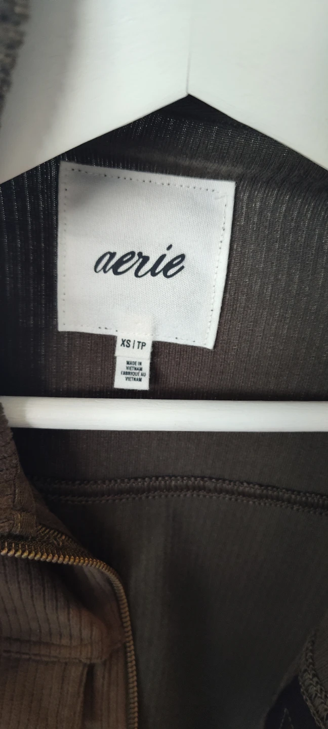 It's an Aerie cropped jacket in a dark green corduroy. The size is XS and it's made from a soft fabric. This jacket is perfect for layering on cooler days!