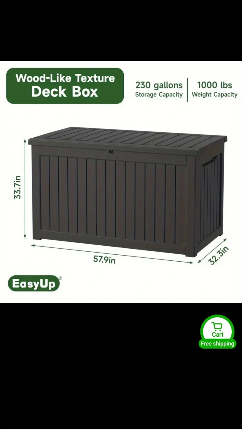 This is a large deck box with a wood-like texture. It offers 230 gallons of storage capacity and a weight capacity of 1000 lbs. The dimensions are 57.9in length, 32.3in width, and 33.7in height. Great for storing patio cushions and garden tools!