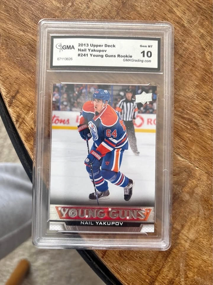 Graded 2013 Upper Deck Young Guns rookie card of Nail Yakupov (#241). GMA Gem Mint 10. Original slab in great condition. Edmonton Oilers Young Guns rookie. Clean display piece for Oilers fans or Young Guns collectors. Card shown is the exact card you will receive. Stored safely in a smoke-free home. Located in Edmonton. Pickup preferred.