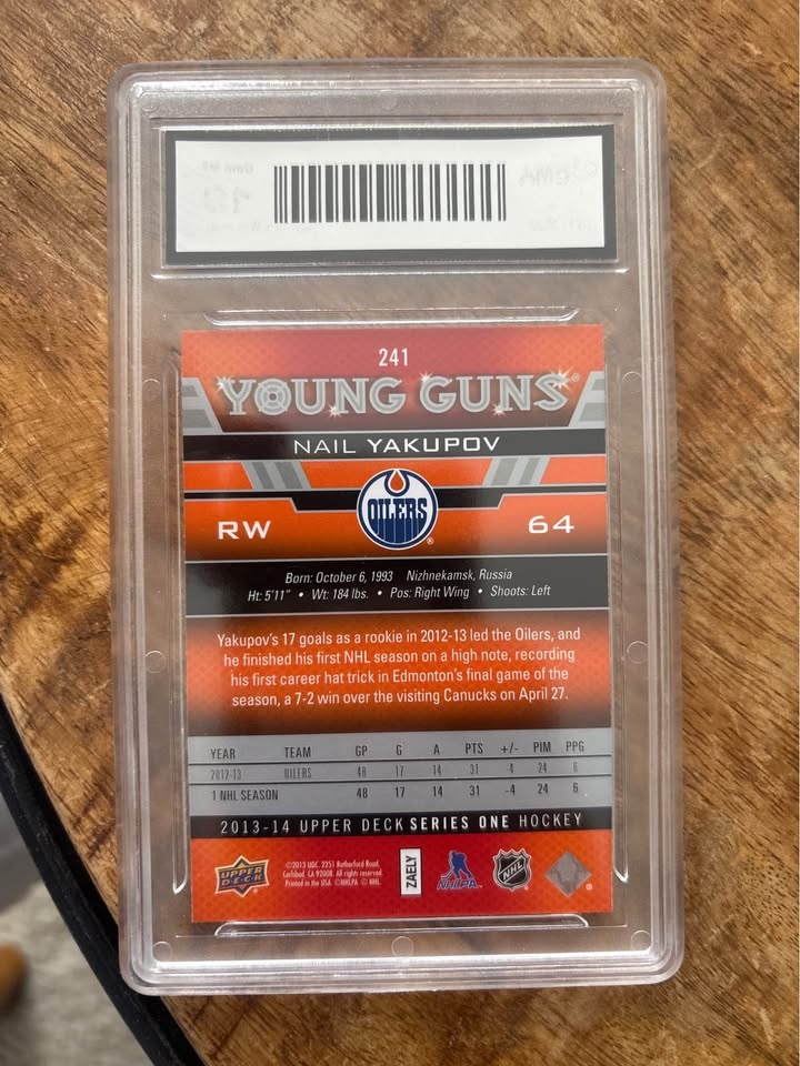 Graded 2013 Upper Deck Young Guns rookie card of Nail Yakupov (#241). GMA Gem Mint 10. Original slab in great condition. Edmonton Oilers Young Guns rookie. Clean display piece for Oilers fans or Young Guns collectors. Card shown is the exact card you will receive. Stored safely in a smoke-free home. Located in Edmonton. Pickup preferred.