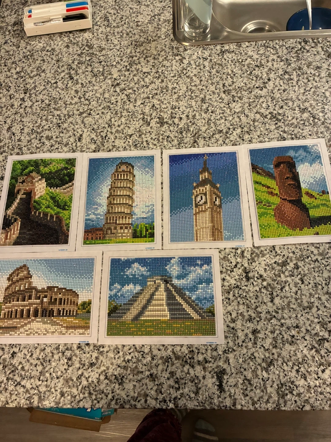 Six complete diamond painting canvases featuring famous world landmarks. Includes the Great Wall of China, Leaning Tower of Pisa, Big Ben, Easter Island Moai, Colosseum, and Chichen Itza. Fun for craft enthusiasts!