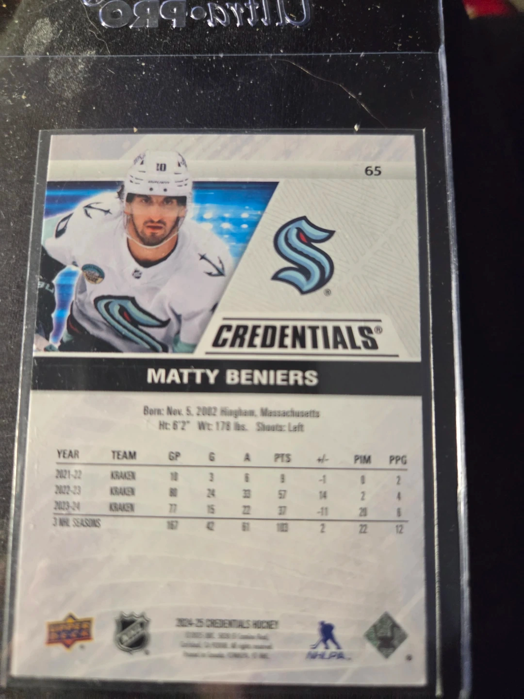 This is a 2024-25 Upper Deck Credentials hockey card featuring Matty Beniers. It includes his birthdate and career stats. Born November 5, 2002, in Hingham, Massachusetts.
