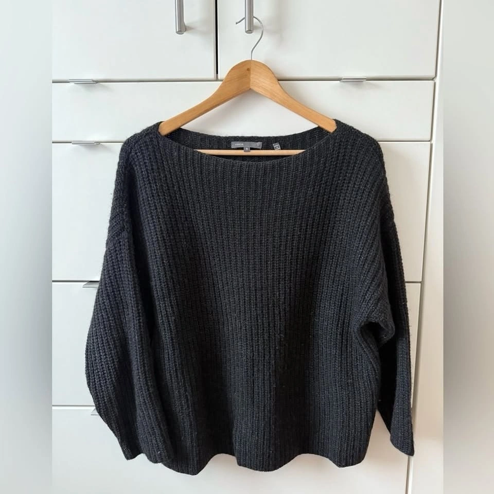 Vince black sweater in good pre-loved condition. A timeless, versatile piece from a higher-end brand known for quality and elevated basics. Originally sold through Revolve at a higher price point. Minor pilling consistent with gentle wear. No stains or rips. Label is slightly faded, but fabric is a wool blend. Size: Small. Smoke-free, pet-free home. A classic wardrobe staple that works for everyday wear or elevated layering.
