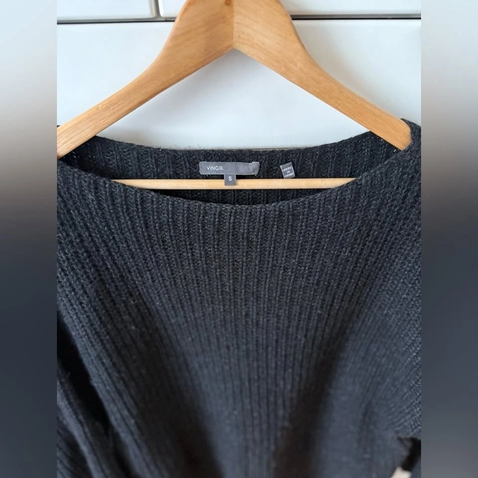 Vince black sweater in good pre-loved condition. A timeless, versatile piece from a higher-end brand known for quality and elevated basics. Originally sold through Revolve at a higher price point. Minor pilling consistent with gentle wear. No stains or rips. Label is slightly faded, but fabric is a wool blend. Size: Small. Smoke-free, pet-free home. A classic wardrobe staple that works for everyday wear or elevated layering.
