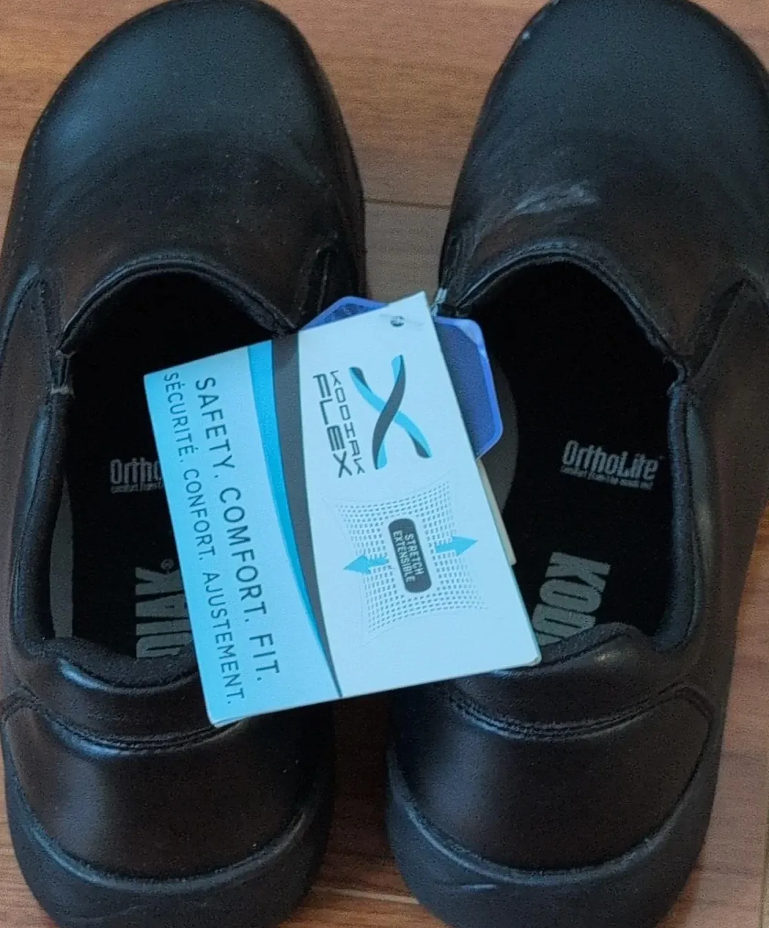 Kodiak Flex slip-on safety shoes. They're black and feature OrthoLite cushioning. Stretch extensible design for comfort.