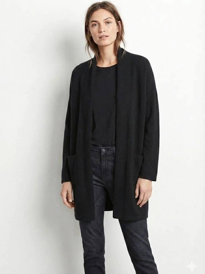 Soft knit longline cardigan in solid black. This open-front sweater has a relaxed fit with dropped shoulders and two large front patch pockets. Material is a smooth, mid-weight knit that hits mid-thigh.