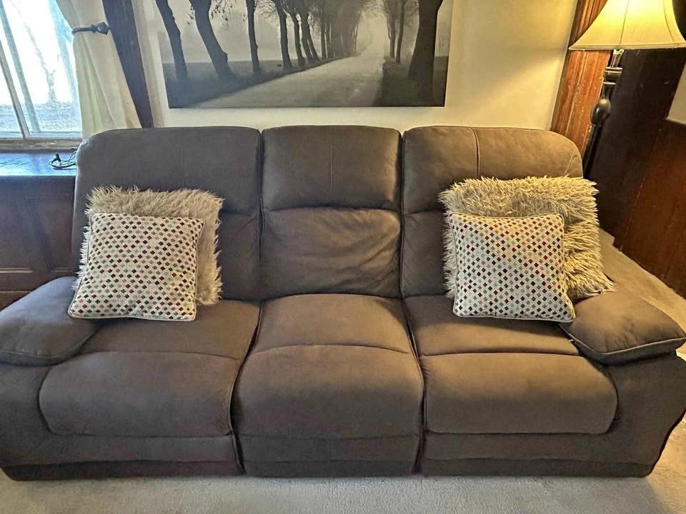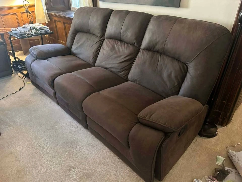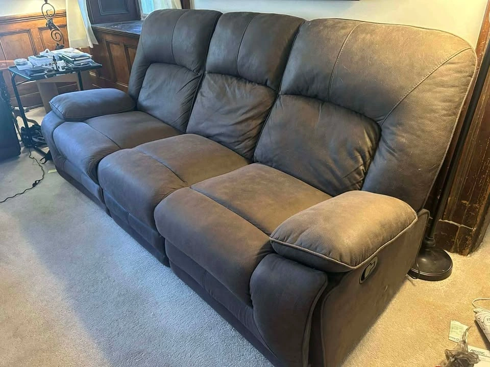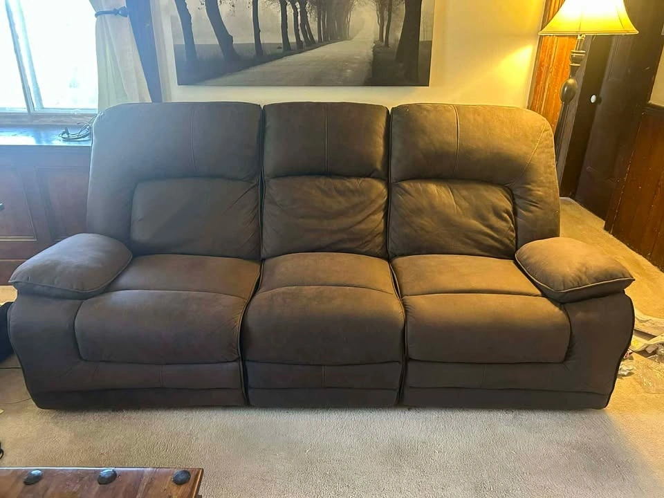 Three seater reclining couch in brown suede. Very good condition, from a non-smoking home. The two-seater section includes two cup holders and USB charging ports in the armrest. Asking $1100 for both, or best offer. Collection only in Ayr, Ontario.