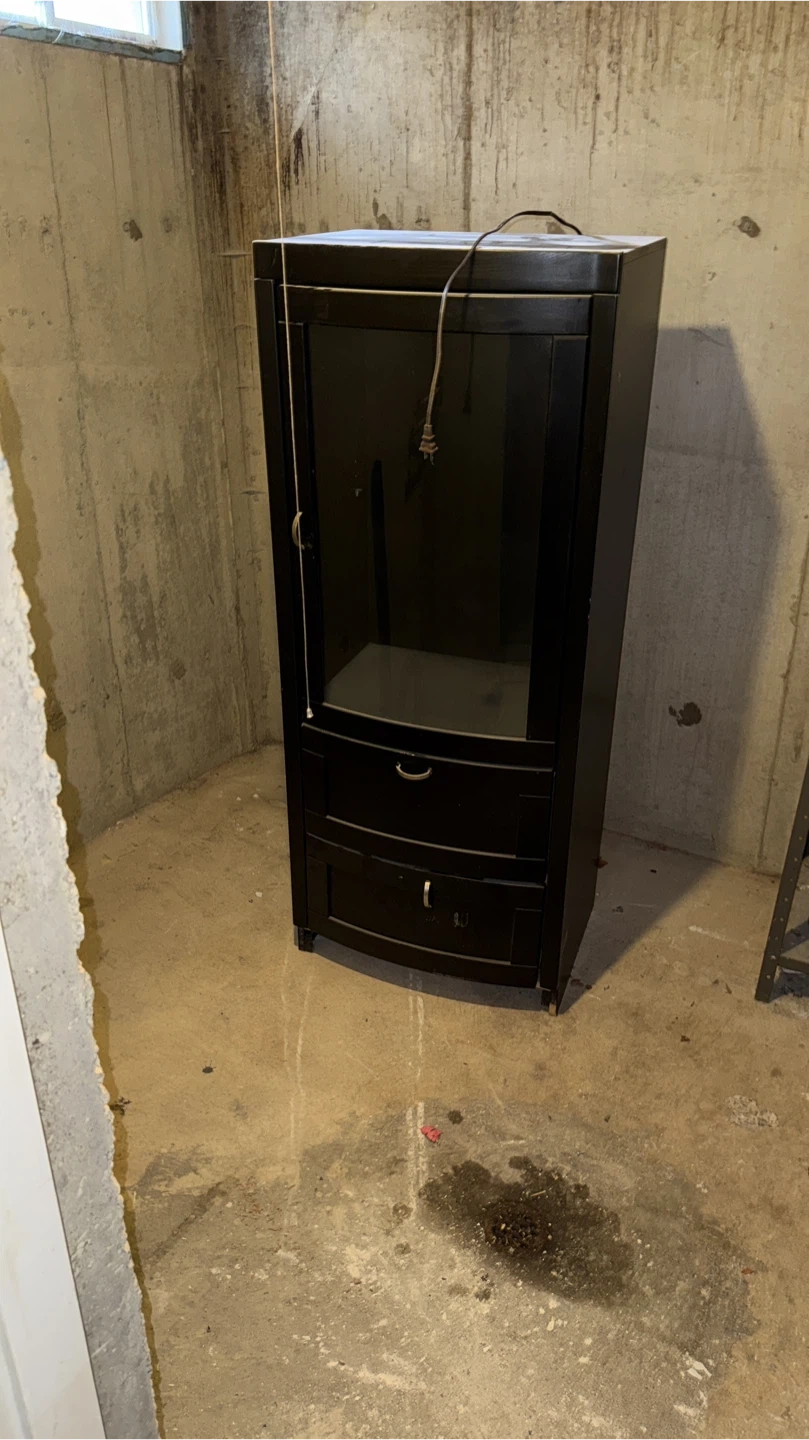 Black curio cabinet featuring a glass-fronted door and two lower drawers. It's a nice piece for displaying items or for general storage. Dimensions approximately 24" W x 16" D x 48" H.