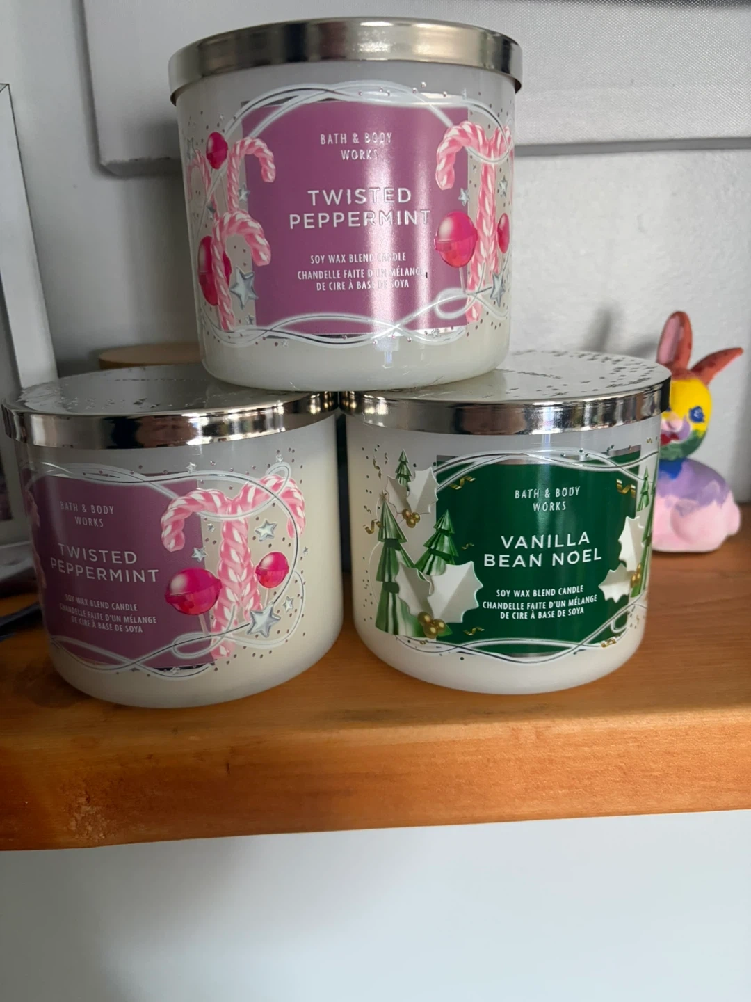 Three Bath & Body Works soy wax blend candles. Includes two Twisted Peppermint and one Vanilla Bean Noel scent. These candles are perfect for creating a festive atmosphere during the holidays!