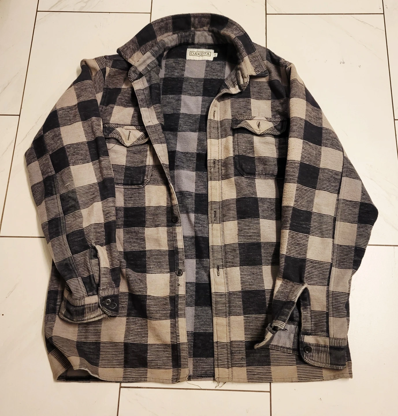 Here's a cozy Dakota flannel shirt in a classic plaid pattern. It's a size large and in great condition. Perfect for layering or wearing on its own!$30 each