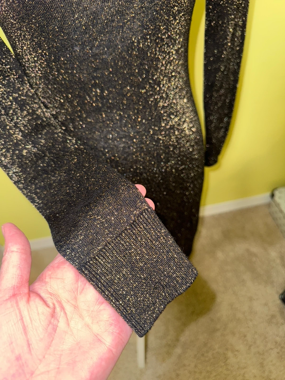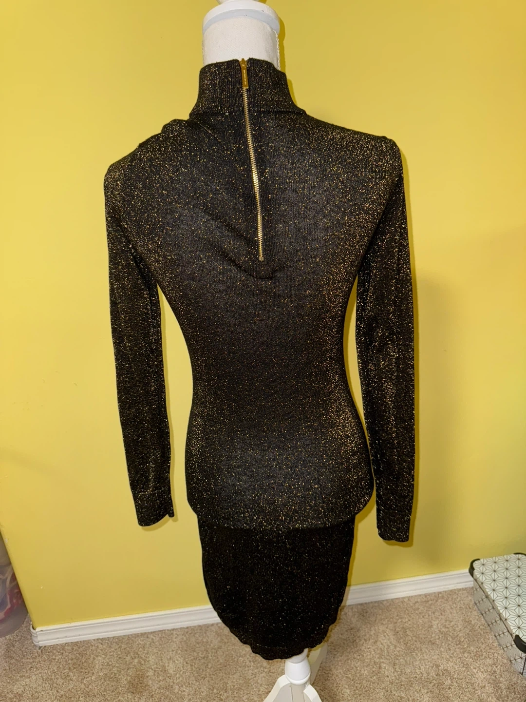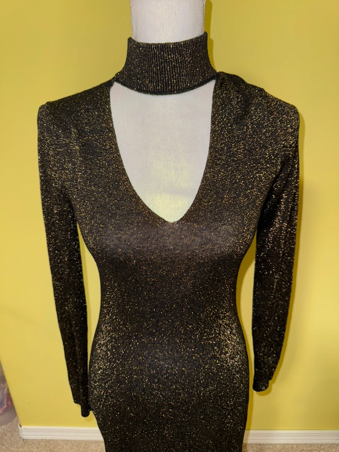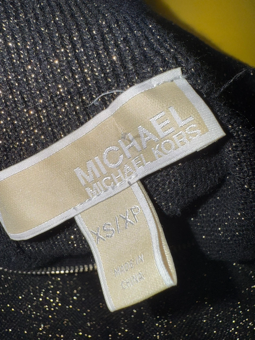 Selling a stylish Michael Kors dress in size XS. It features a unique choker-style neckline and a subtle gold shimmer throughout the black fabric. Perfect for a night out!
