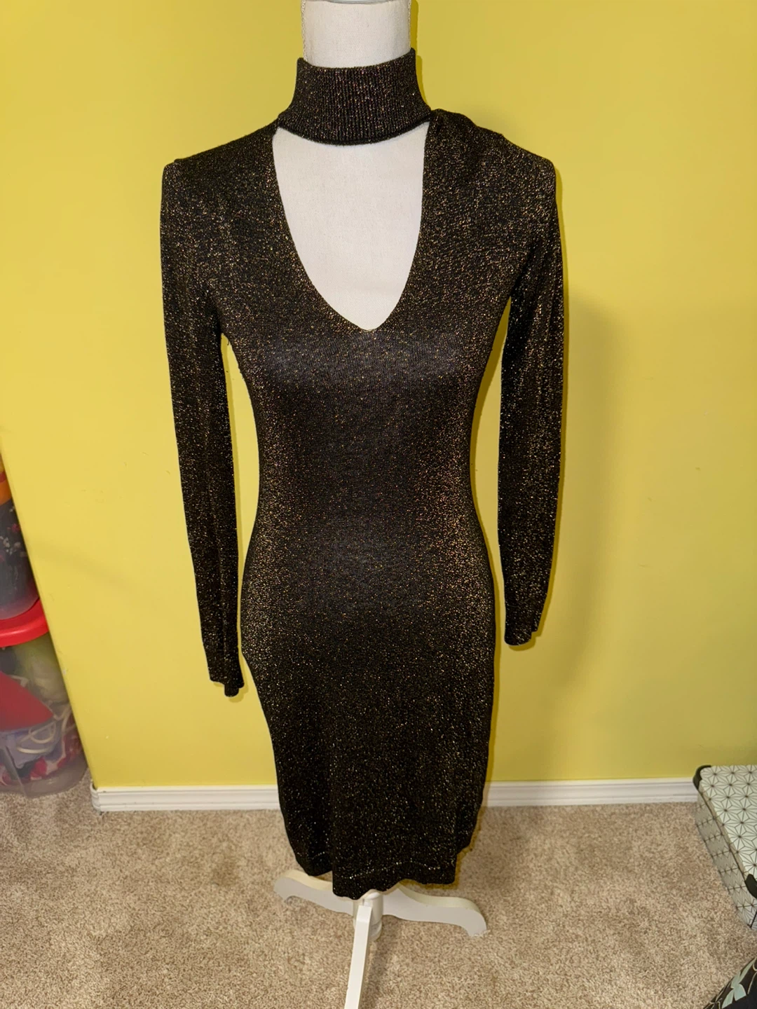 Selling a stylish Michael Kors dress in size XS. It features a unique choker-style neckline and a subtle gold shimmer throughout the black fabric. Perfect for a night out!