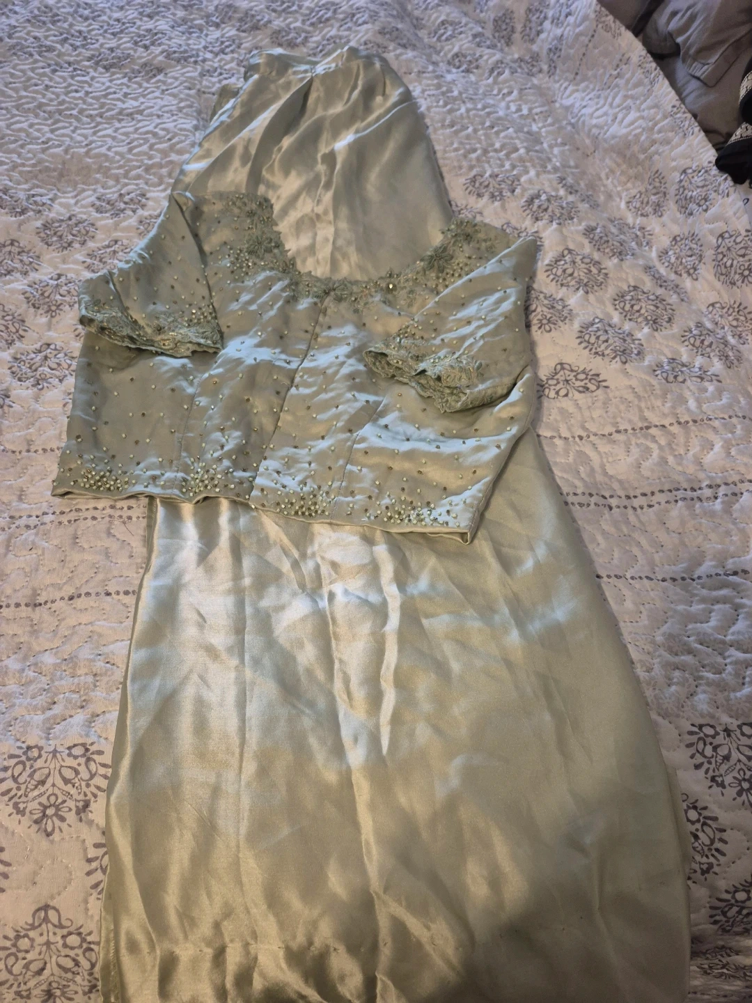 Selling a lovely saariwith an embellished top. The dress is a light blue colour. It appears to be in great condition!