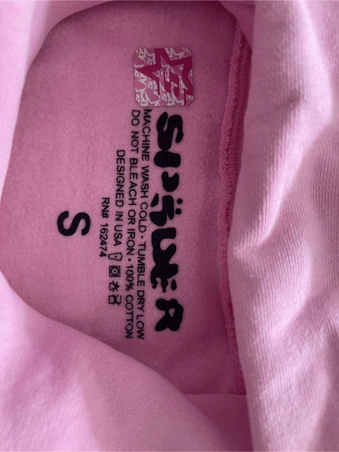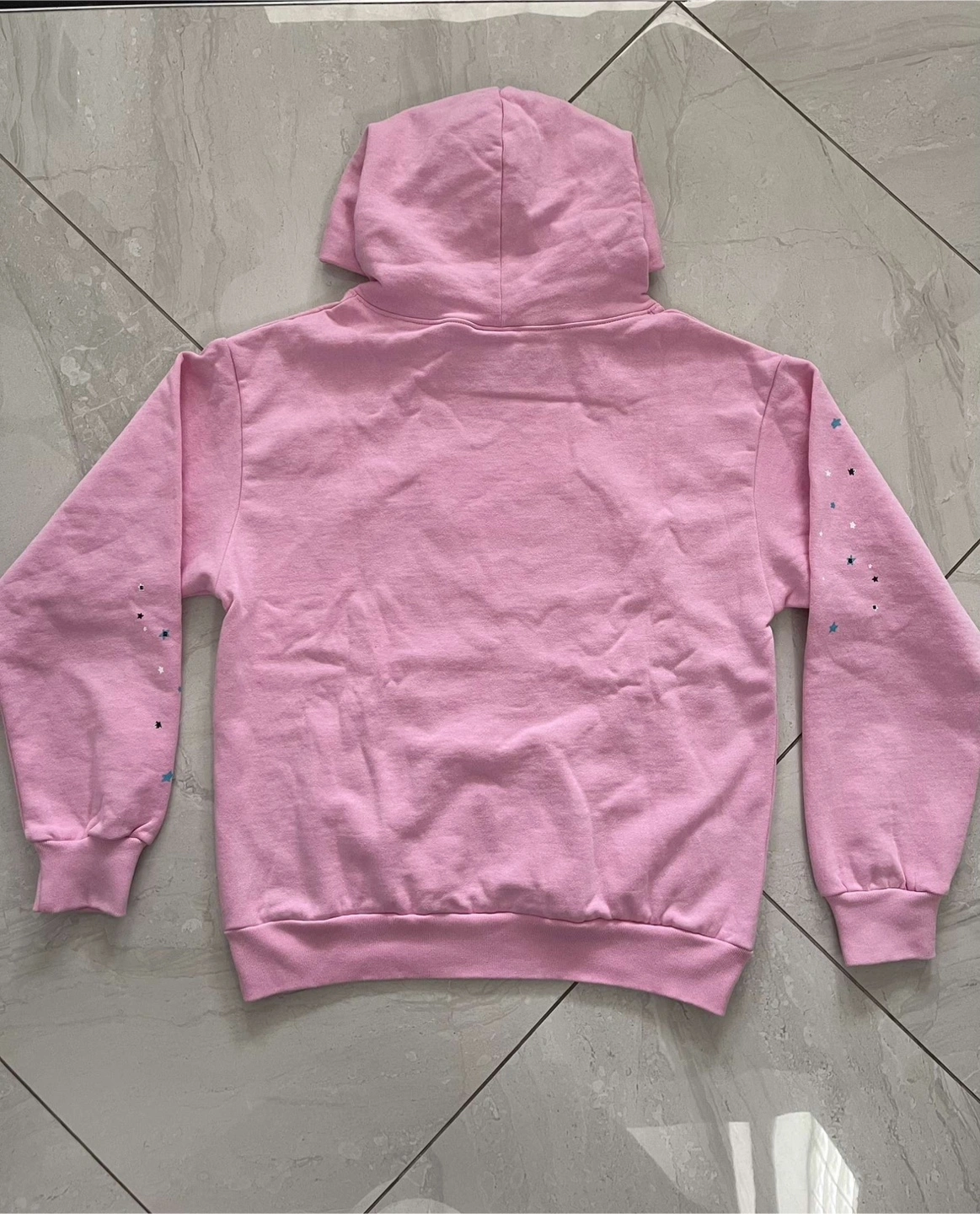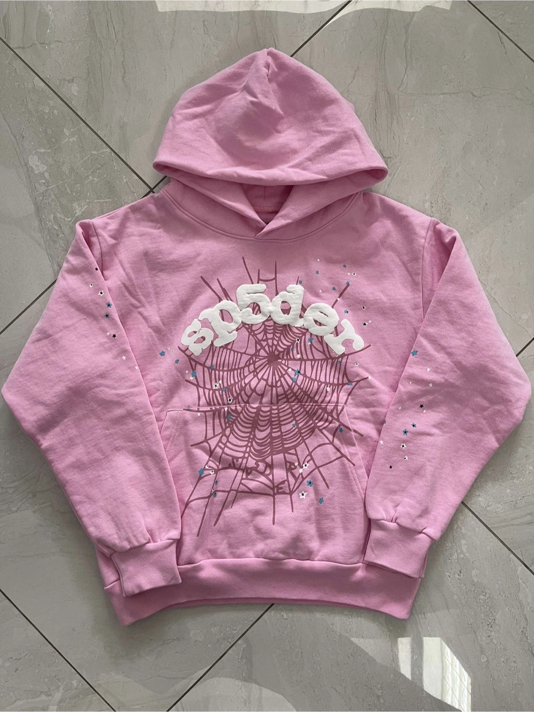 Selling a pink Spider hoodie in size small! The material is 100% cotton and the design features a spider web with the word "Spider" across the front. Price is negotiable