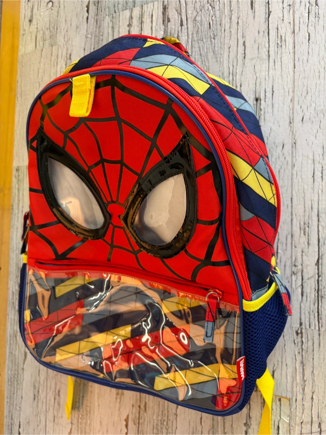 This is a fun Spider-Man themed backpack for kids! It has adjustable shoulder straight and a front zippered pocket. Perfect for carrying school supplies or essentials on the go.