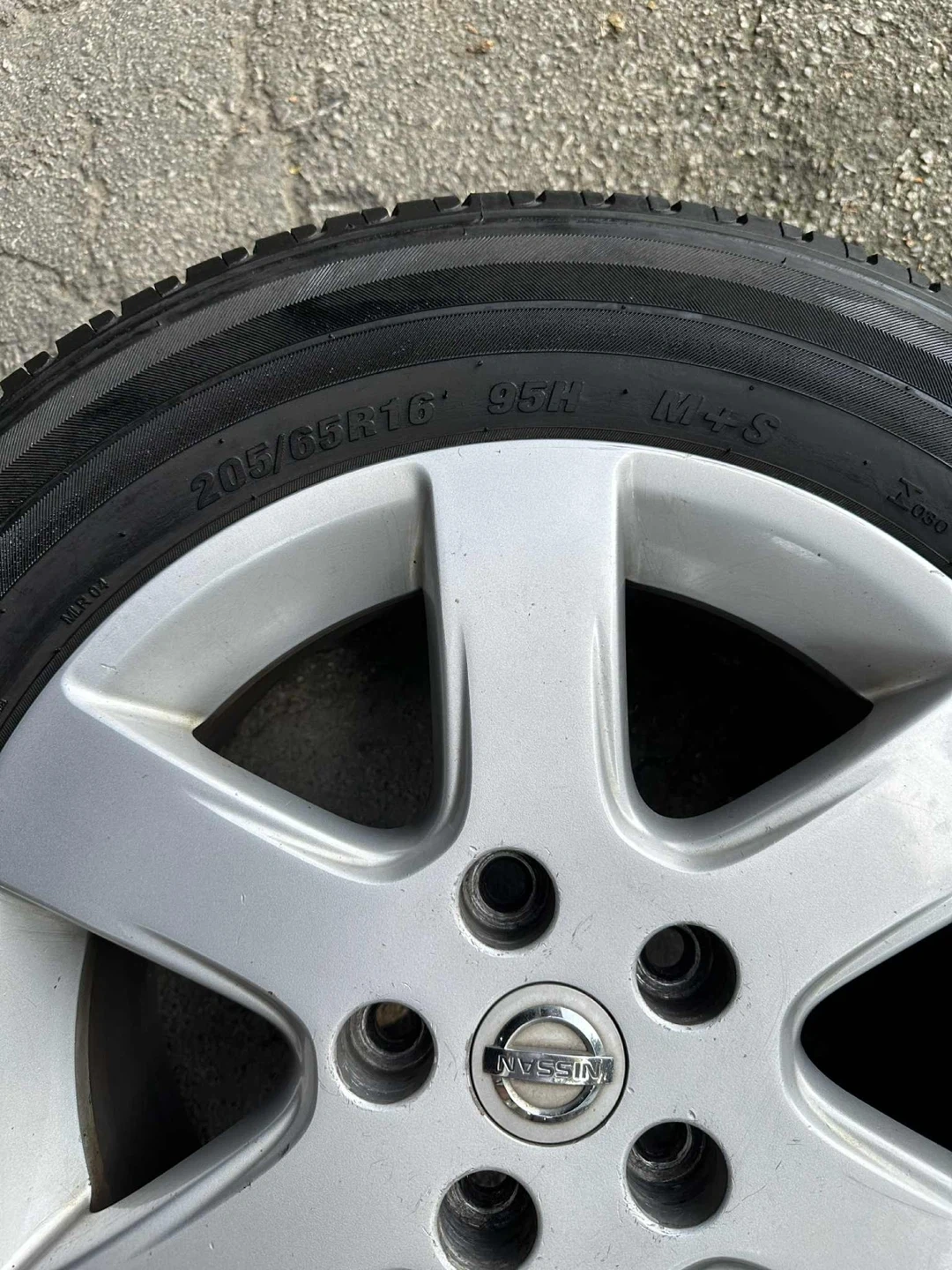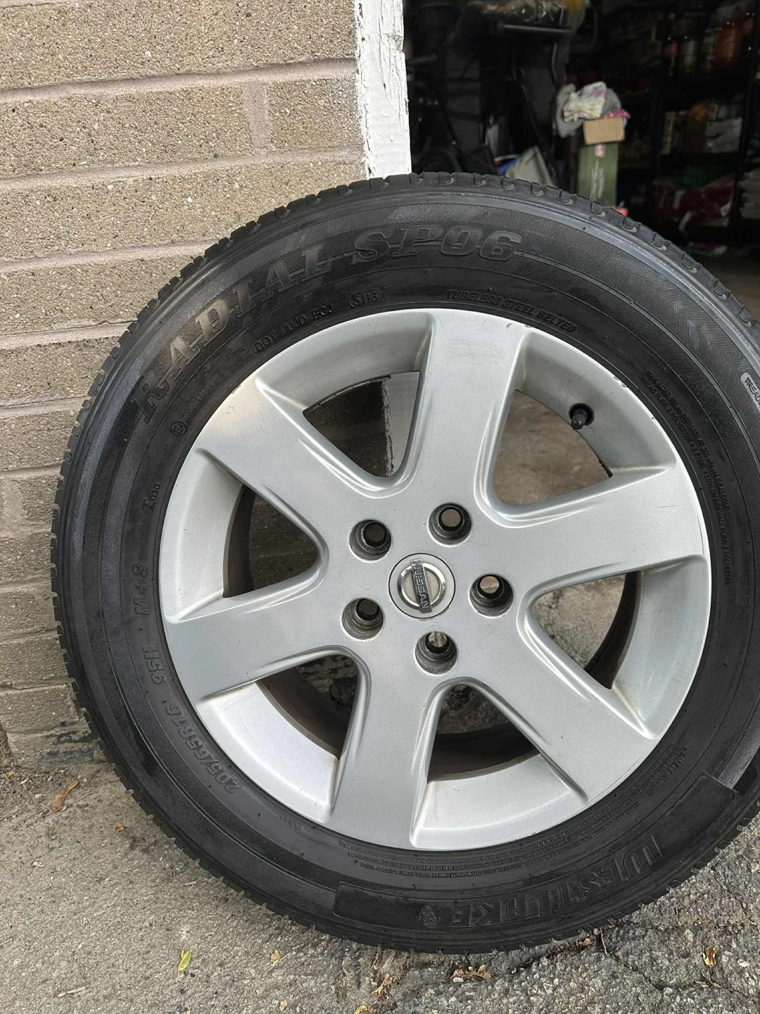 One Nissan tire and rim. Tire size is 205/65R16 with a 95H speed rating. It's a Radial SP06 tire. Great for replacing a damaged wheel! Four All seasons wheels with aluminum rim. Price is negotiable!!