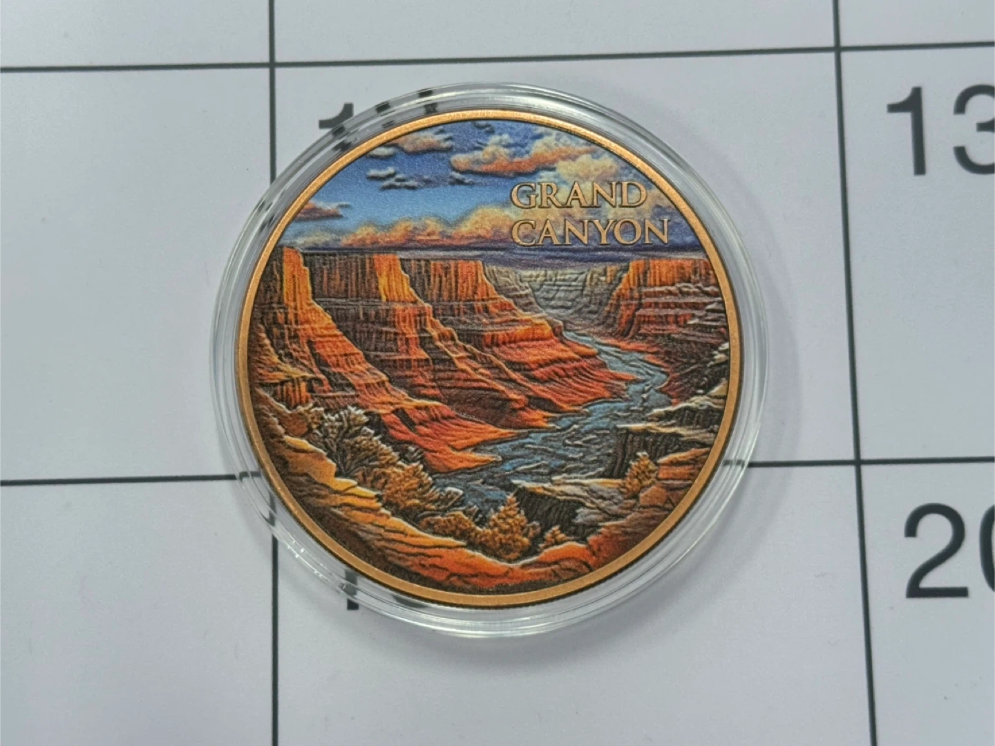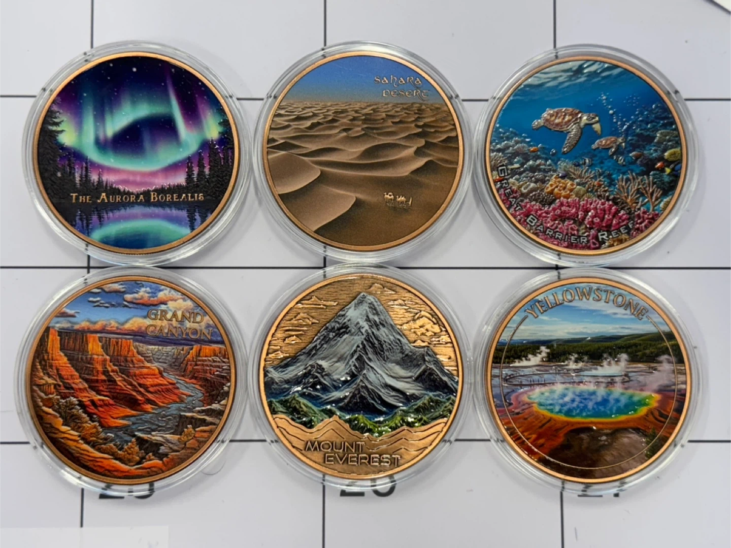 6 collectible medallions featuring famous Canadian and international landmarks. Designs include Grand Canyon, The Aurora Borealis, Sahara Desert, Great Barrier Reef, Mount Everest, and Yellowstone. Each medallion comes in a protective plastic case.
