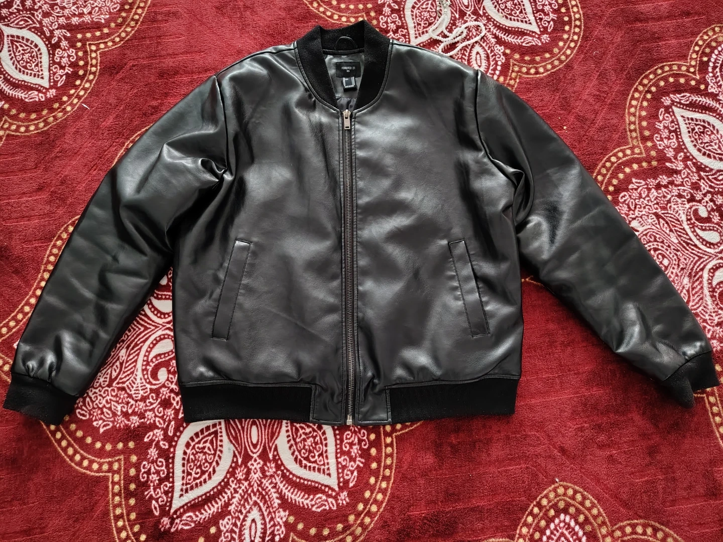 Selling a Forever 21 Men's bomber jacket in size large. It's a sleek black faux leather, perfect for adding a bit of edge to your look! The jacket is in great condition and ready for a new owner. Let me know if you are interested.