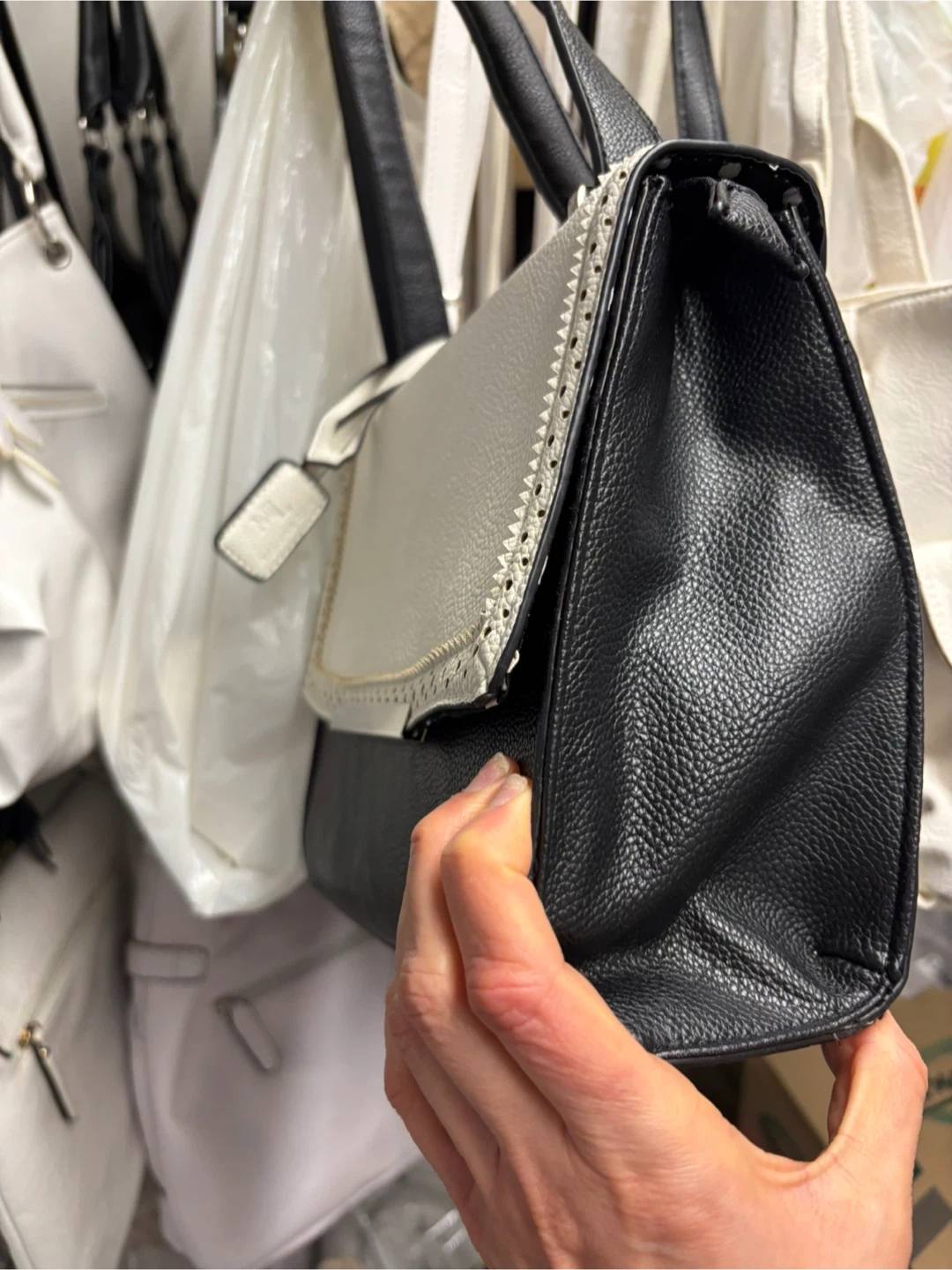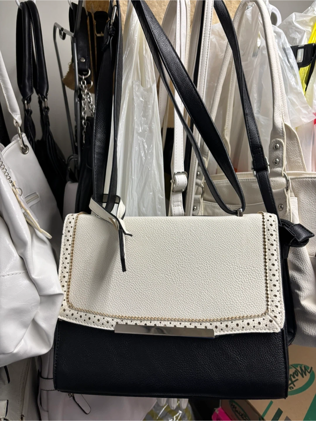 Stylish black and white crossbody handbag with a textured finish. Features a secure zipper closure on the back and a decorative perforated flap with gold-tone accents. The strap is adjustable for comfortable wear.