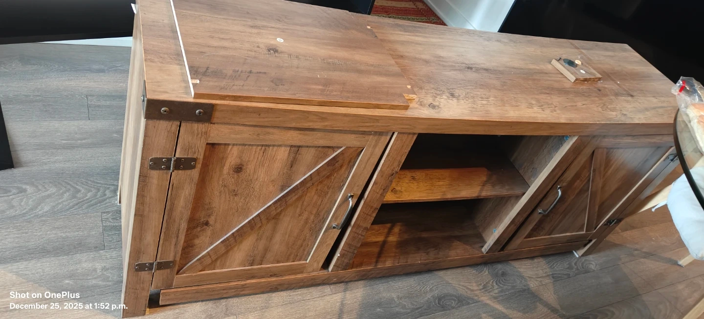 Selling a rustic wood TV stand with barn door style cabinets. It has open shelving for media components and cord management cutouts in the back. A stylish and functional piece for your living room!