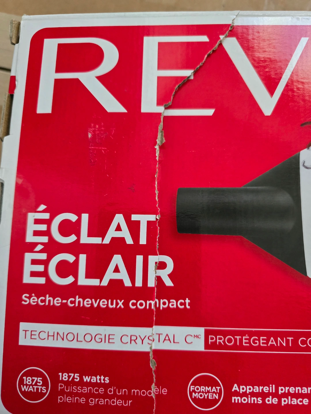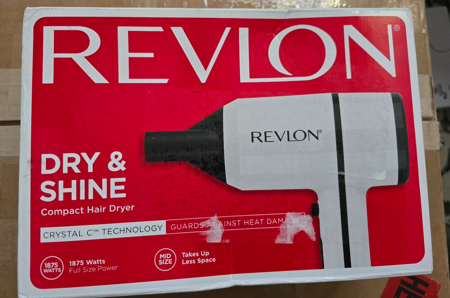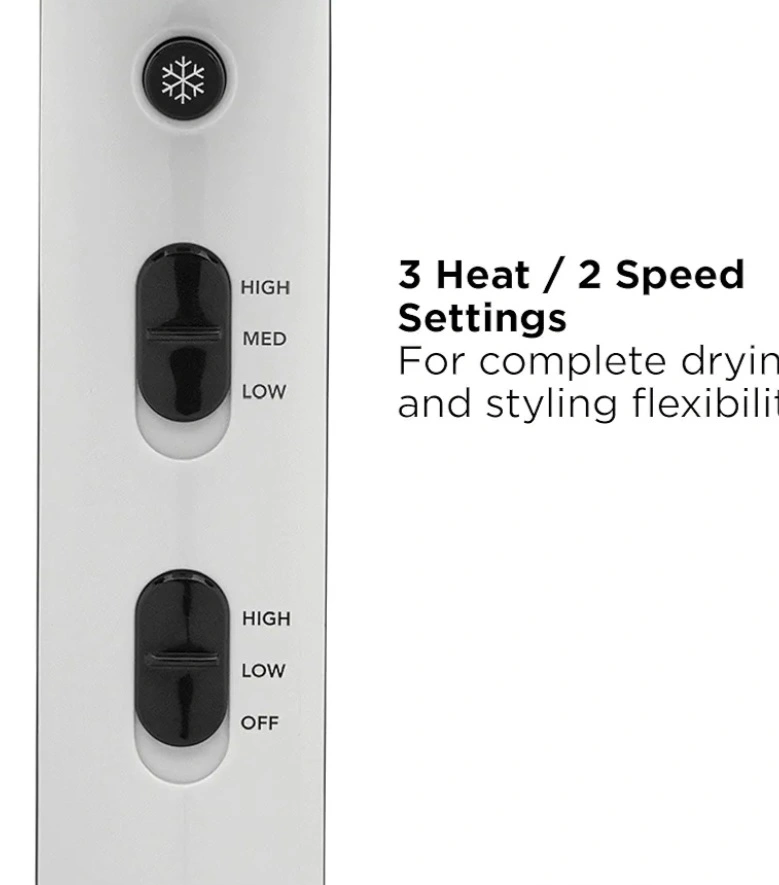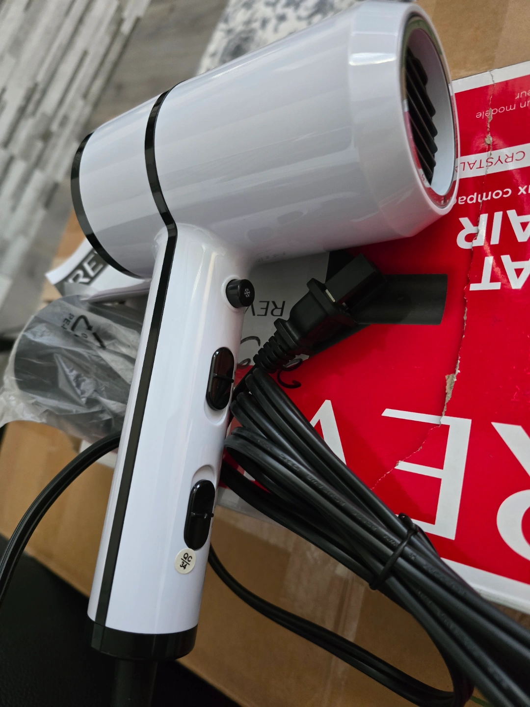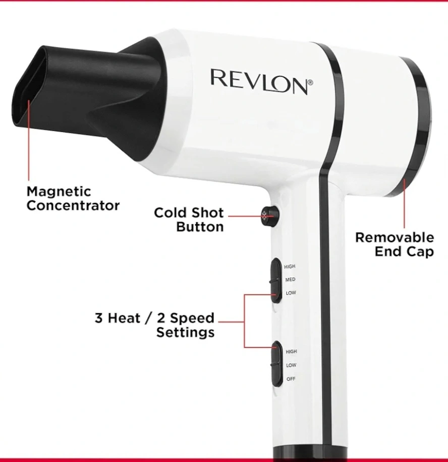 Revlon hair dryer. Compact design. White and black. Three heat settings and two speed settings. Features a cold shot button and a magnetic concentrator. Includes removable end cap. Crystal technology for shiny, frizz-free results.