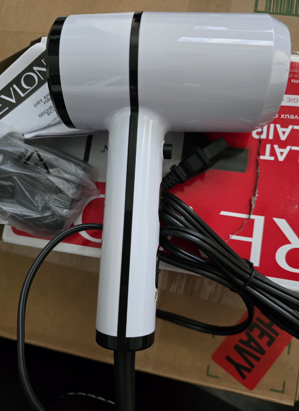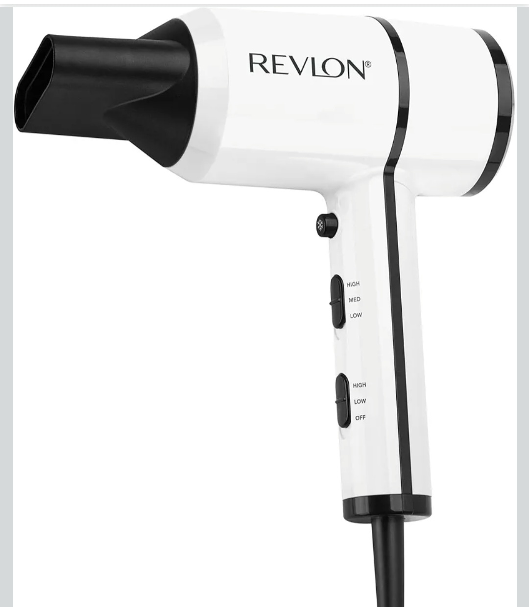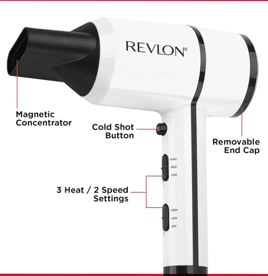 Revlon hair dryer. Compact design. White and black. Three heat settings and two speed settings. Features a cold shot button and a magnetic concentrator. Includes removable end cap. Crystal technology for shiny, frizz-free results.