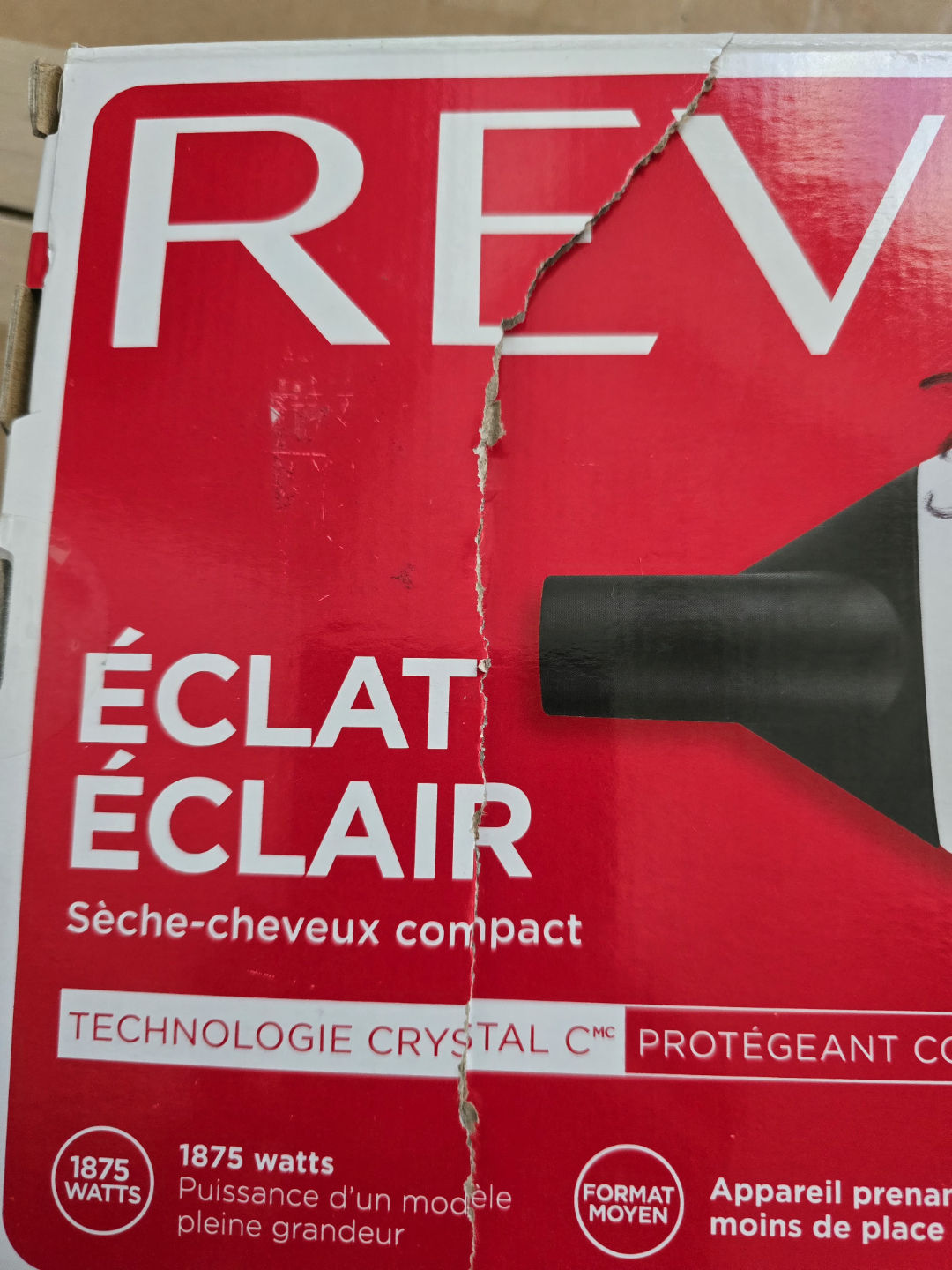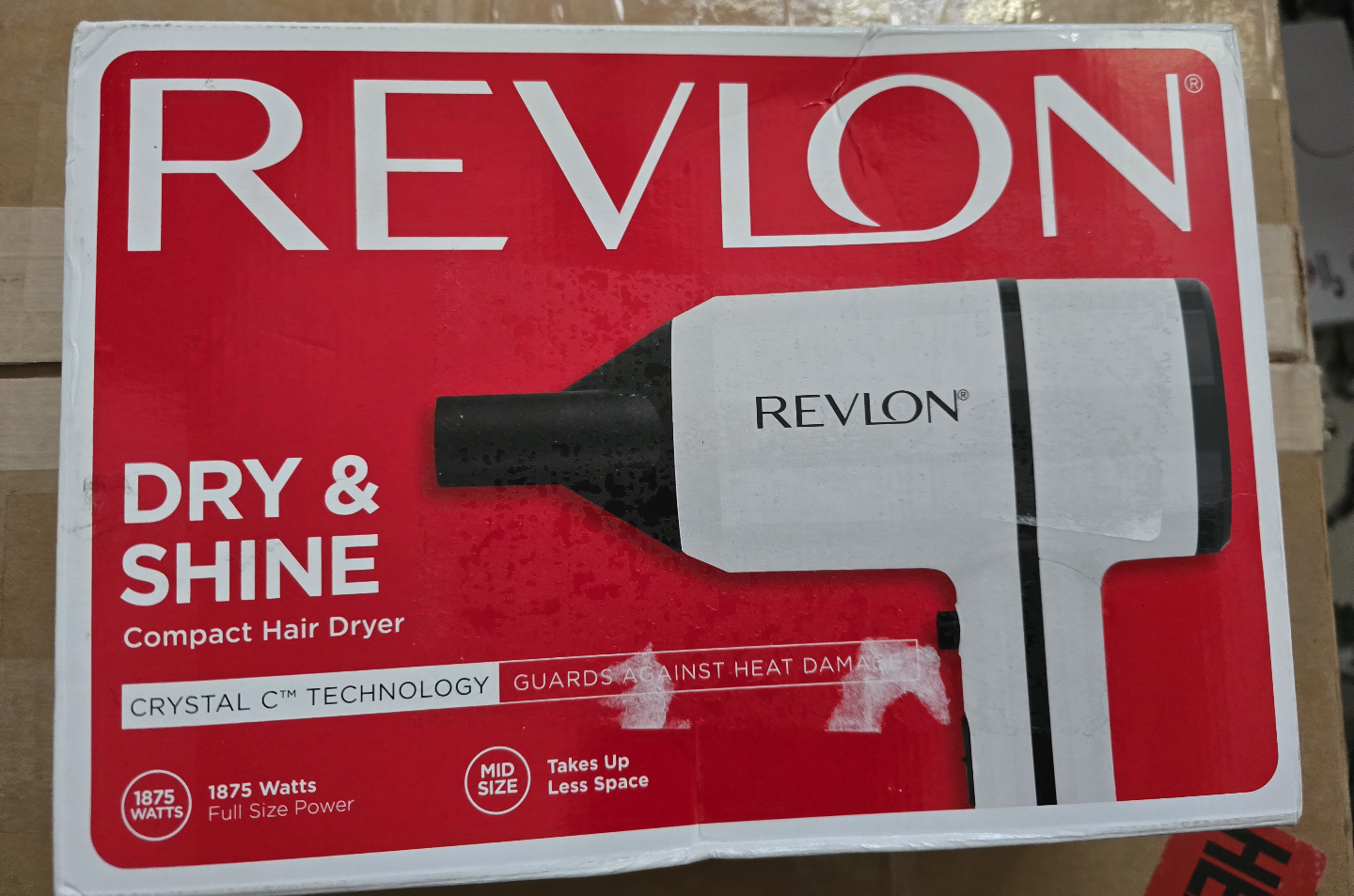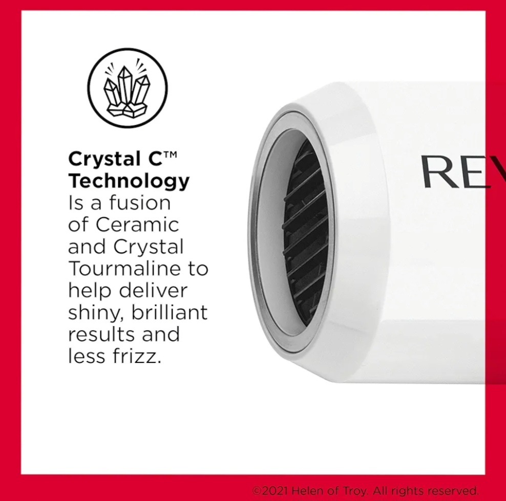 Revlon hair dryer. Compact design. White and black. Three heat settings and two speed settings. Features a cold shot button and a magnetic concentrator. Includes removable end cap. Crystal technology for shiny, frizz-free results.