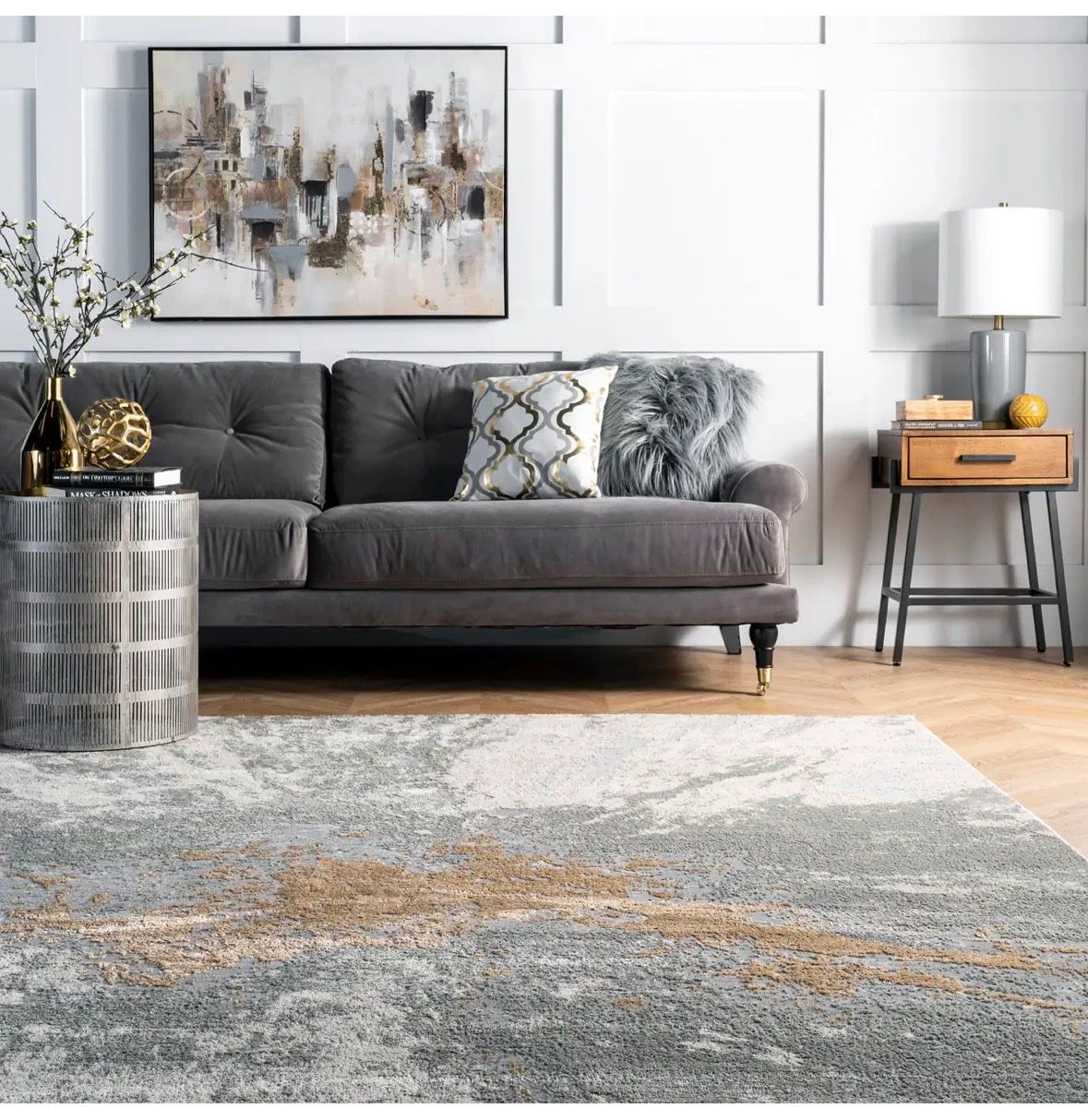 Used. Material: 73% Recycled Polypropylene, 27% Recycled Polyester. Size: 6’7” x 9’. Thickness: Medium pile (0.40 inch) - sleek and versatile. Made in Turkey. Color: Gray. Shape: Rectangular. Type: Area rug. Dimensions: 6 x 9 ft.