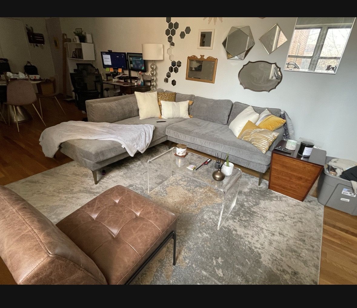 Used. Material: 73% Recycled Polypropylene, 27% Recycled Polyester. Size: 6’7” x 9’. Thickness: Medium pile (0.40 inch) - sleek and versatile. Made in Turkey. Color: Gray. Shape: Rectangular. Type: Area rug. Dimensions: 6 x 9 ft.
