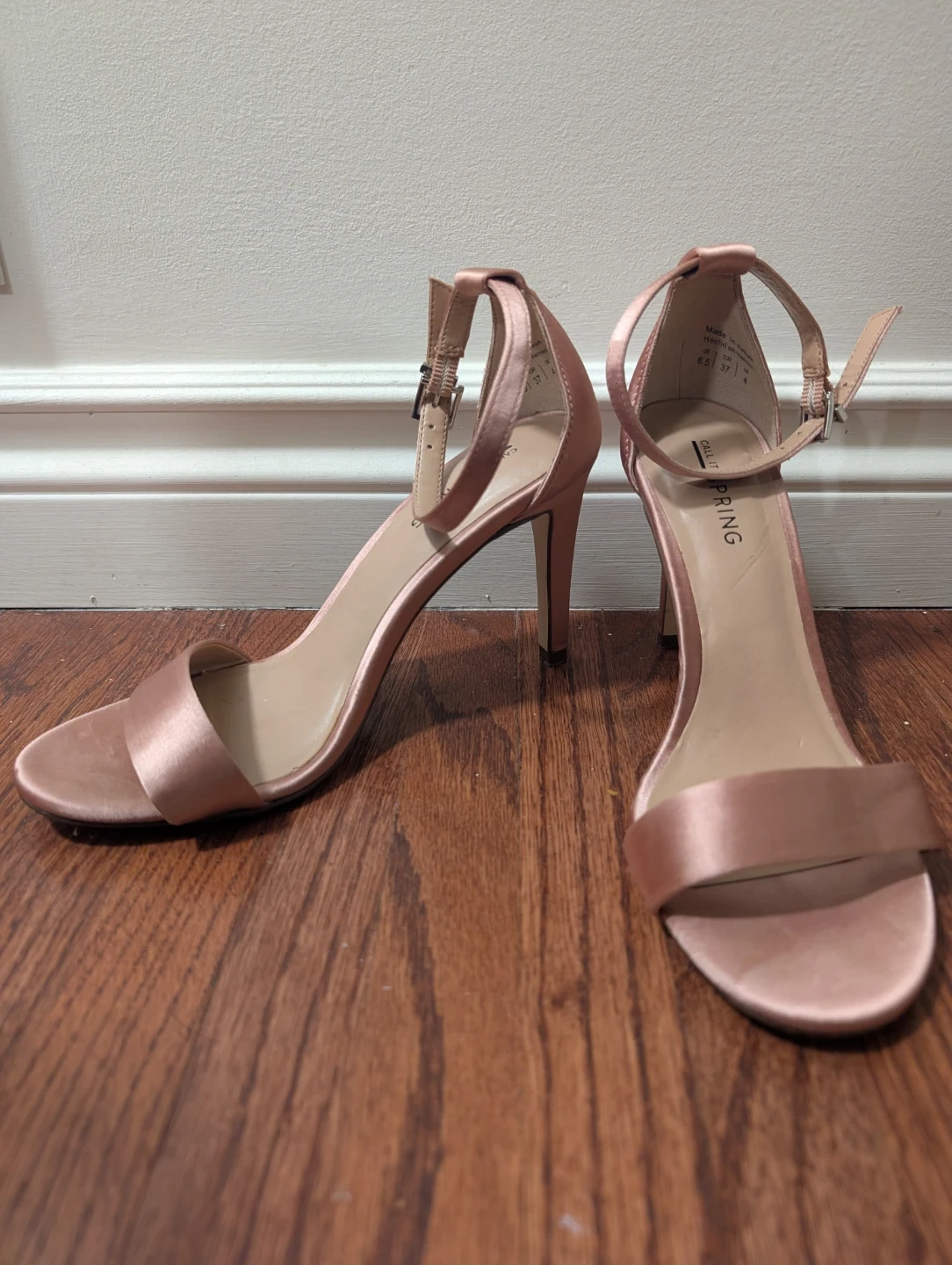 These Call It Spring heels feature a shimmering rose gold satin finish and an elegant ankle strap with buckle closure. The stiletto heel adds height. They're a size 6.5 US.