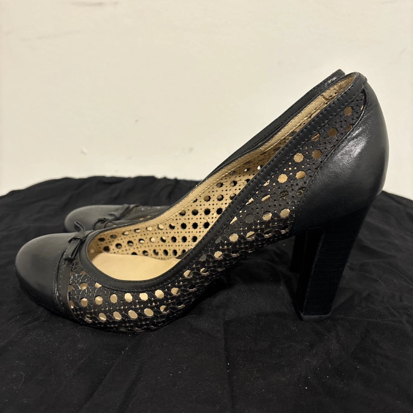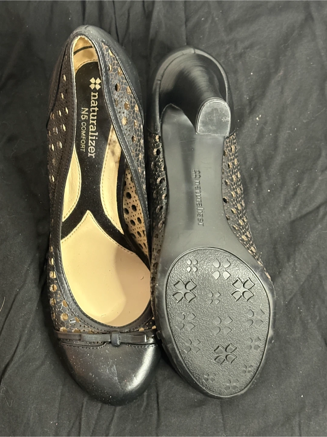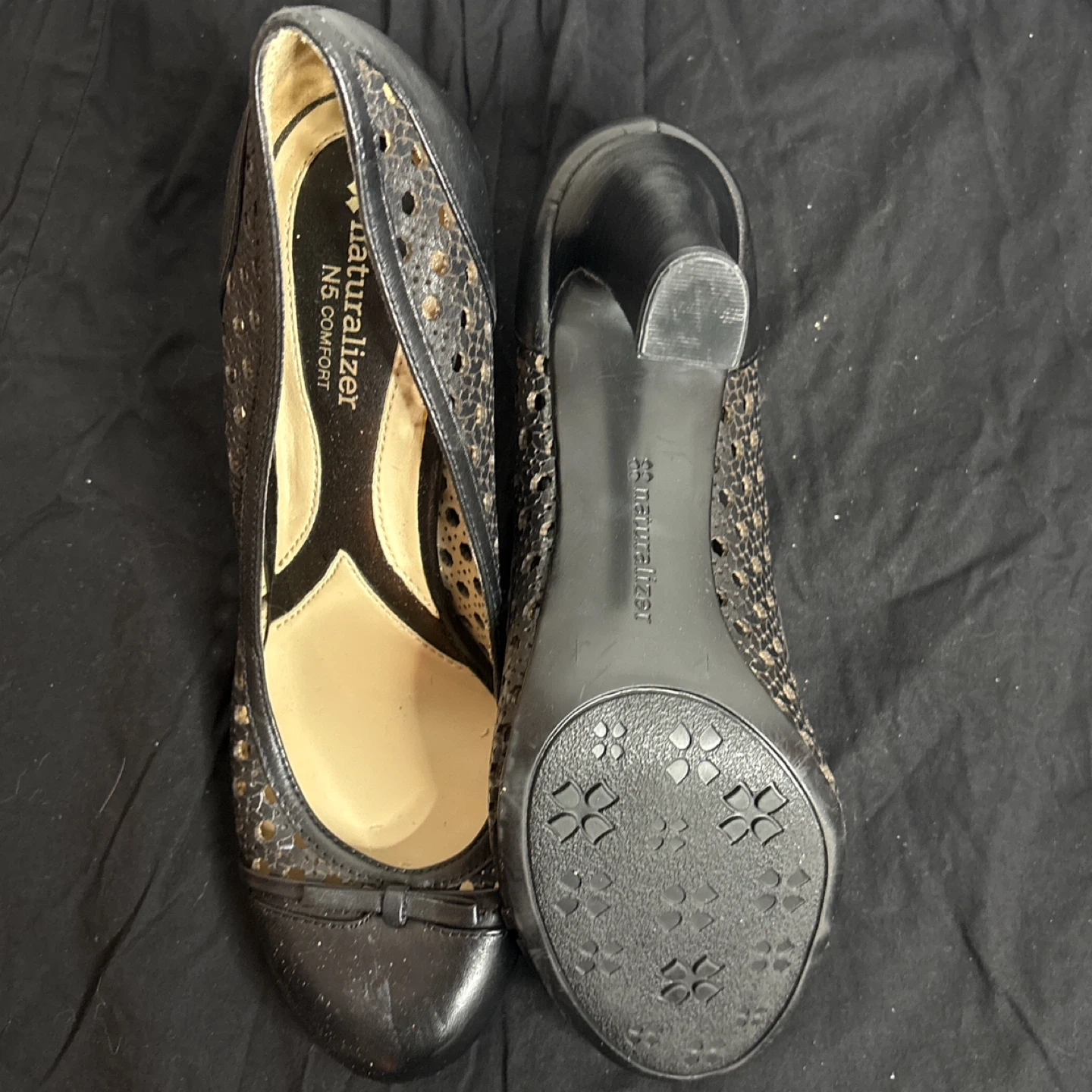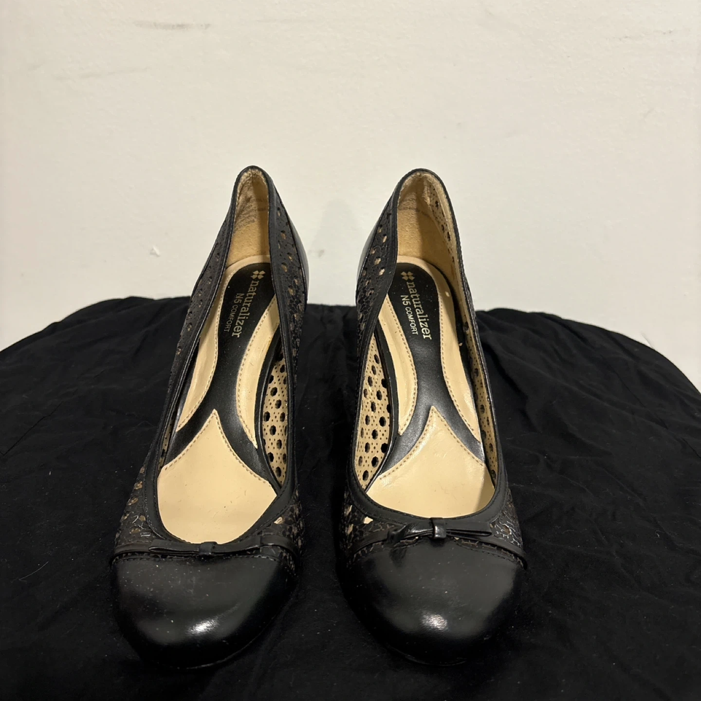 These are a pair of Naturalizer N5 Comfort black heels in size 7.5. They feature a stylish, perforated design. Perfect for adding a touch of elegance to any outfit