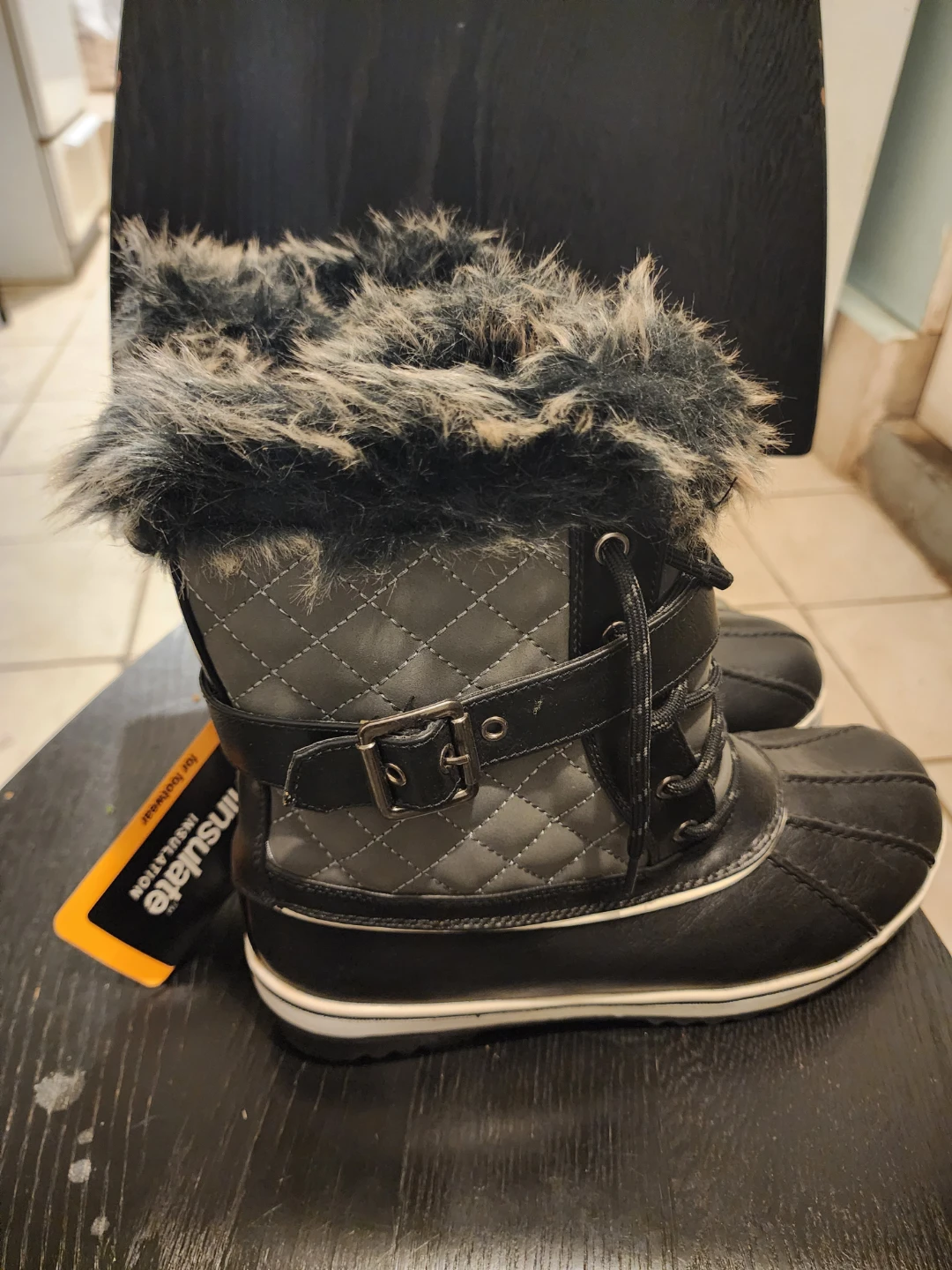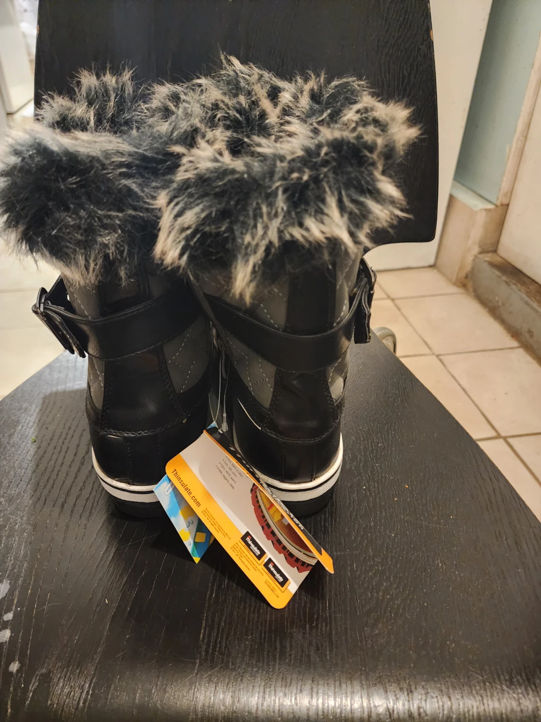 These winter boots are designed for footwear with Thinsulate insulation to keep feet warm. They feature a water-resistant exterior and faux fur trim. Perfect for cold weather conditions!