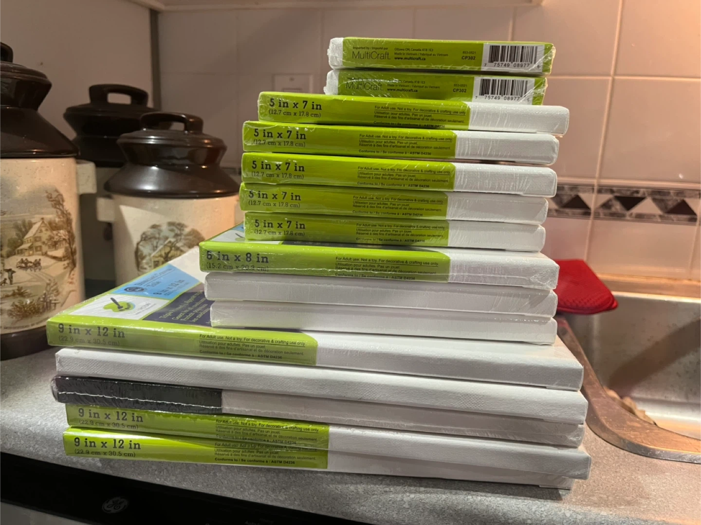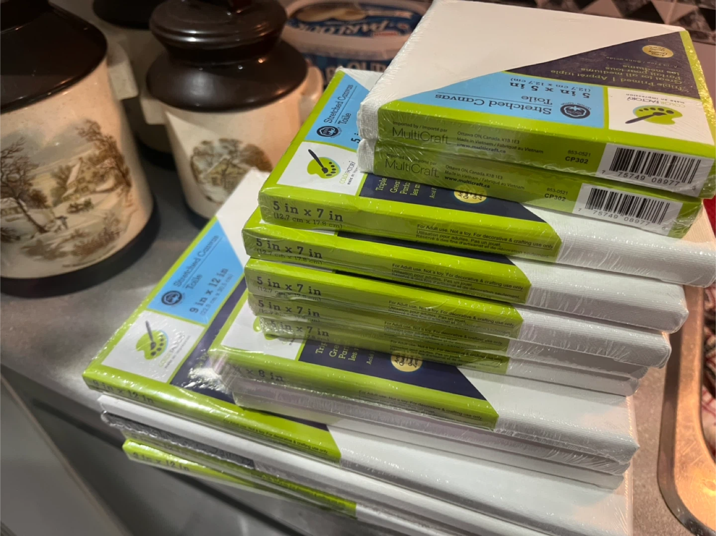 Bulk pack of MultiCraft stretched canvases. Includes multiple sizes: 5 in x 7 in, 5 in x 8 in, and 9 in x 12 in. Ready for your next art project!