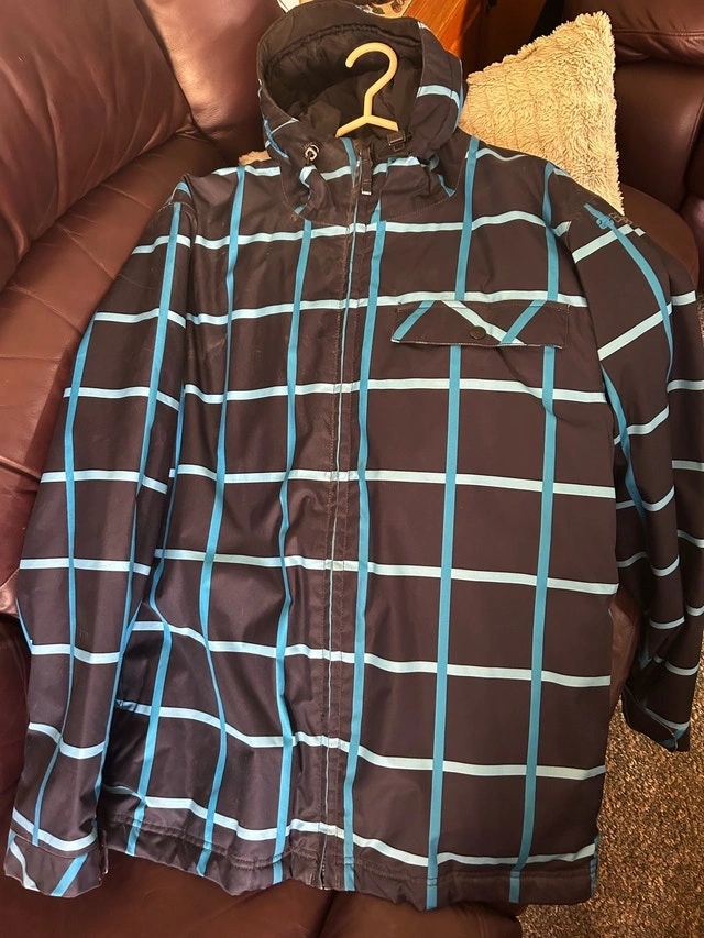 Stay warm and stylish with this Billabong jacket, featuring a distinctive blue plaid pattern, ideal for braving the elements. This jacket is in used, but good, condition, ready for new adventures. Brand: Billabong, Size: M, Colour: Navy with blue plaid, Material: Shell and lining are 100% polyester, Waterproof: 5k waterproofing, 5k breathability. If this ad is up, the jacket is still available.