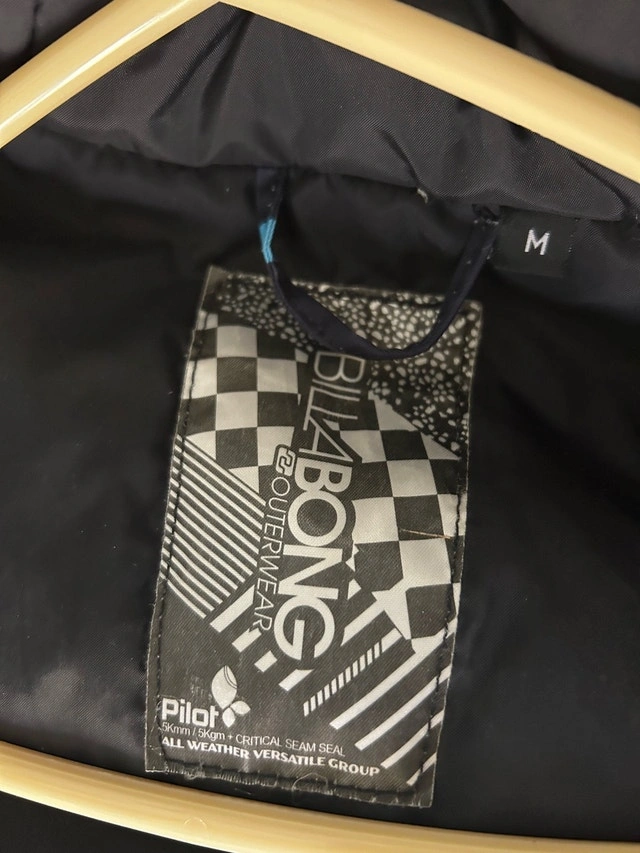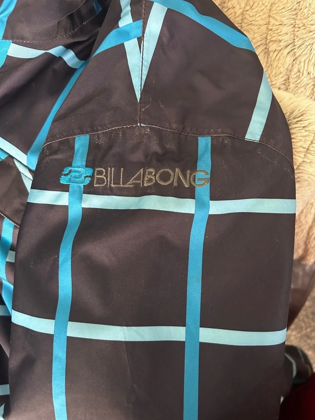 Stay warm and stylish with this Billabong jacket, featuring a distinctive blue plaid pattern, ideal for braving the elements. This jacket is in used, but good, condition, ready for new adventures. Brand: Billabong, Size: M, Colour: Navy with blue plaid, Material: Shell and lining are 100% polyester, Waterproof: 5k waterproofing, 5k breathability. If this ad is up, the jacket is still available.