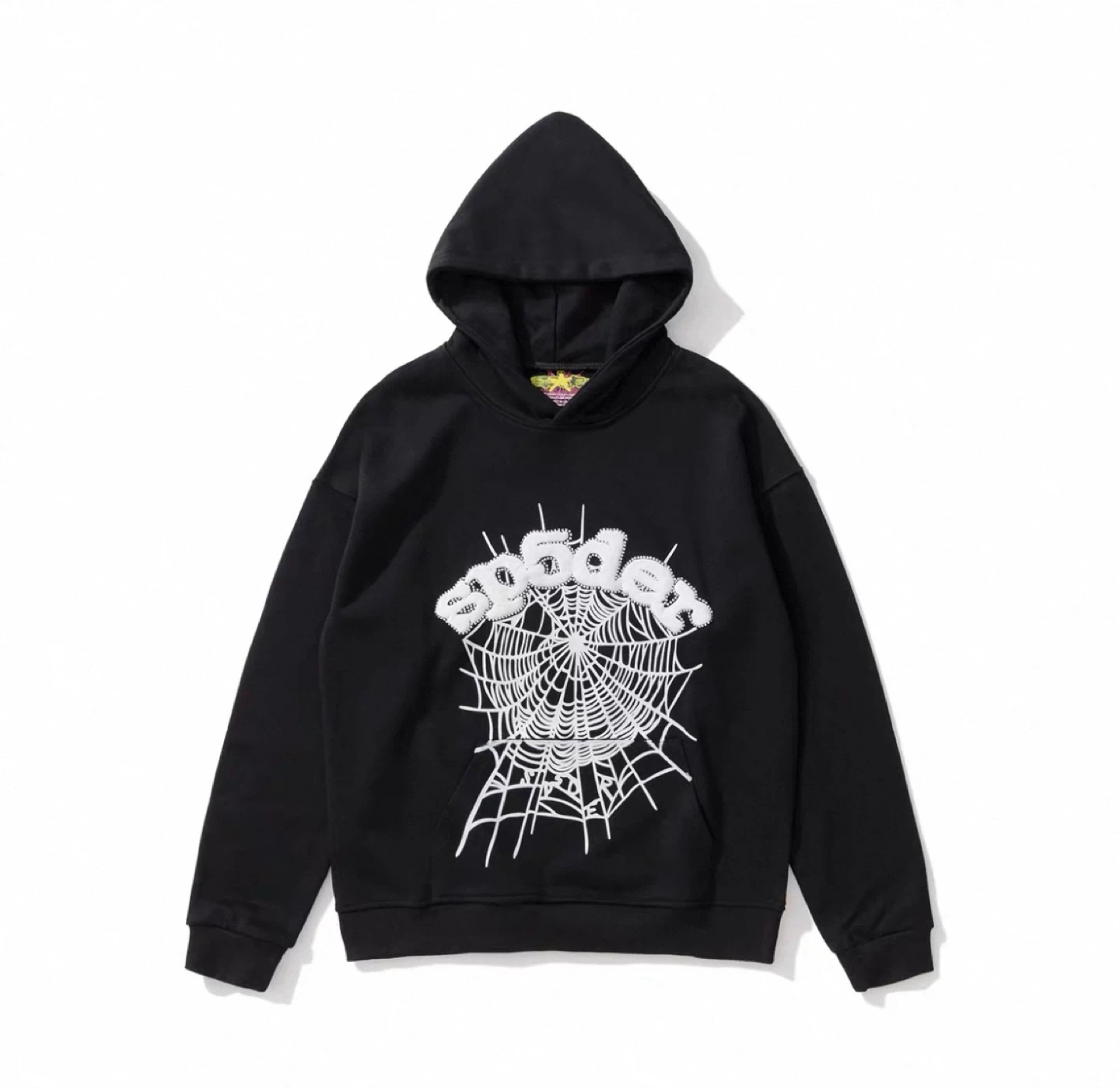 Black Spider Worldwide hoodie with white web graphic and text on the front. It's a comfortable hooded sweatshirt.