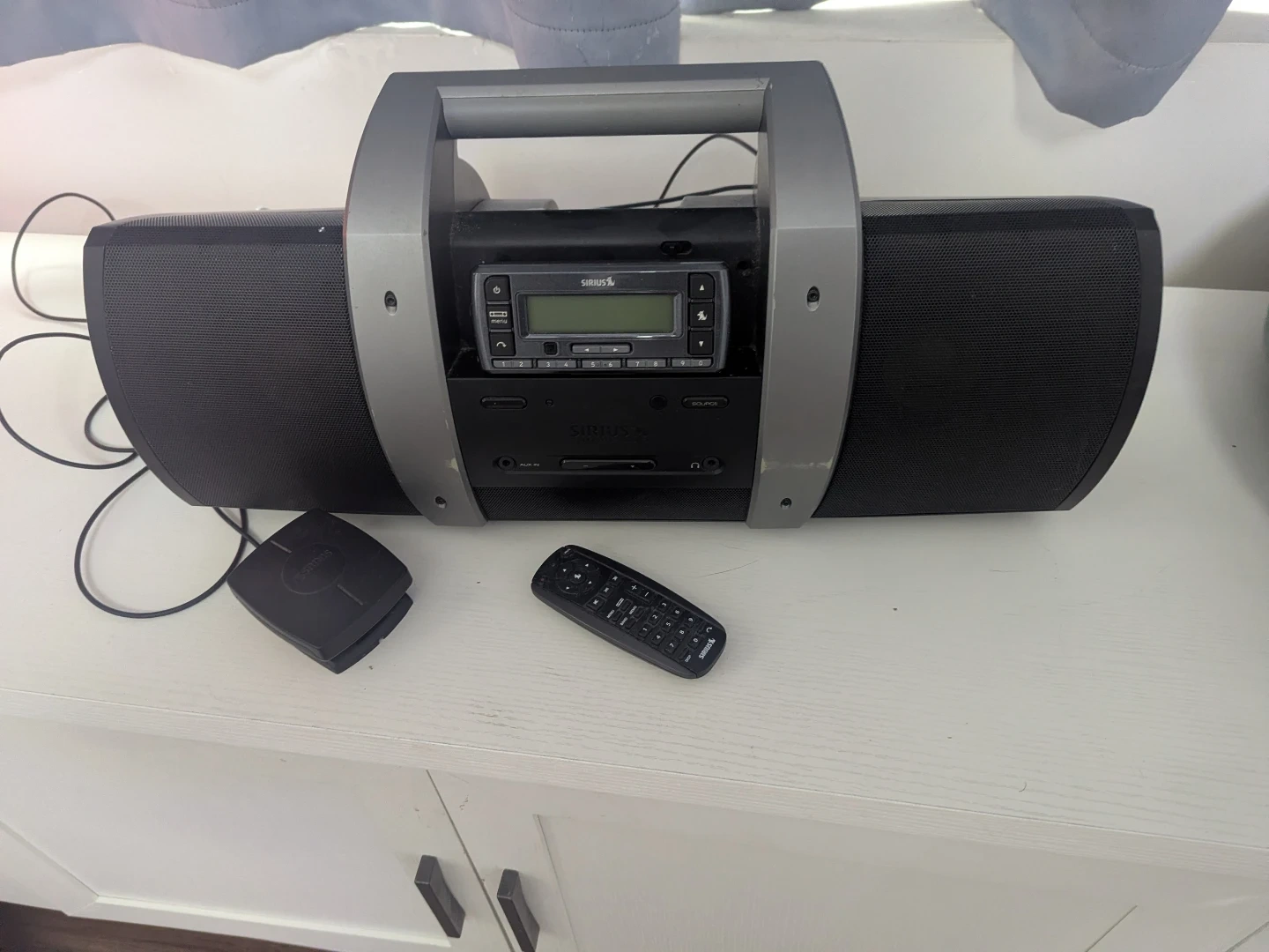 Sirius Satellite Radio boombox. Includes remote control and power adapter. Has aux-in and headphone jack ports. Great for listening to satellite radio at home or on the go!
